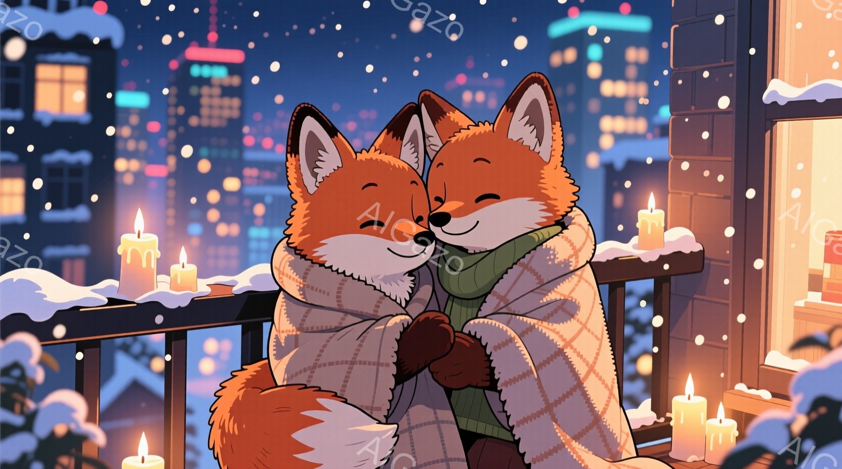 2匹の狐が、暖炉のような暖かい色の毛布に包まれ、寄り添って座っています。彼らは笑顔で、幸せそうな表情をしています。背景には、雪が降る夜の都市のスカイラインと、暖かく光るたくさんのキャンドルが見え、冬のロマンチックな雰囲気を醸し出しています。
