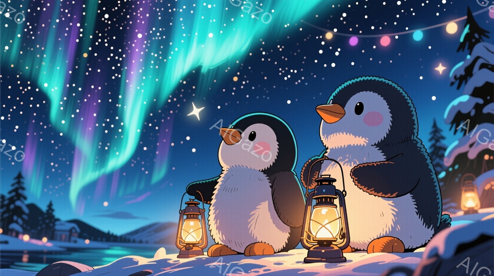雪景色の中に、提灯を持った3匹のペンギンが並んでいます。一番大きなペンギンは微笑んでおり、他の2匹も穏やかな表情をしています。背景には、雪をまとった山々と暗い空に輝くオーロラ、遠くに見える暖かい光の灯りが広がっていて、幻想的な冬の夜の雰囲気を醸し出しています。