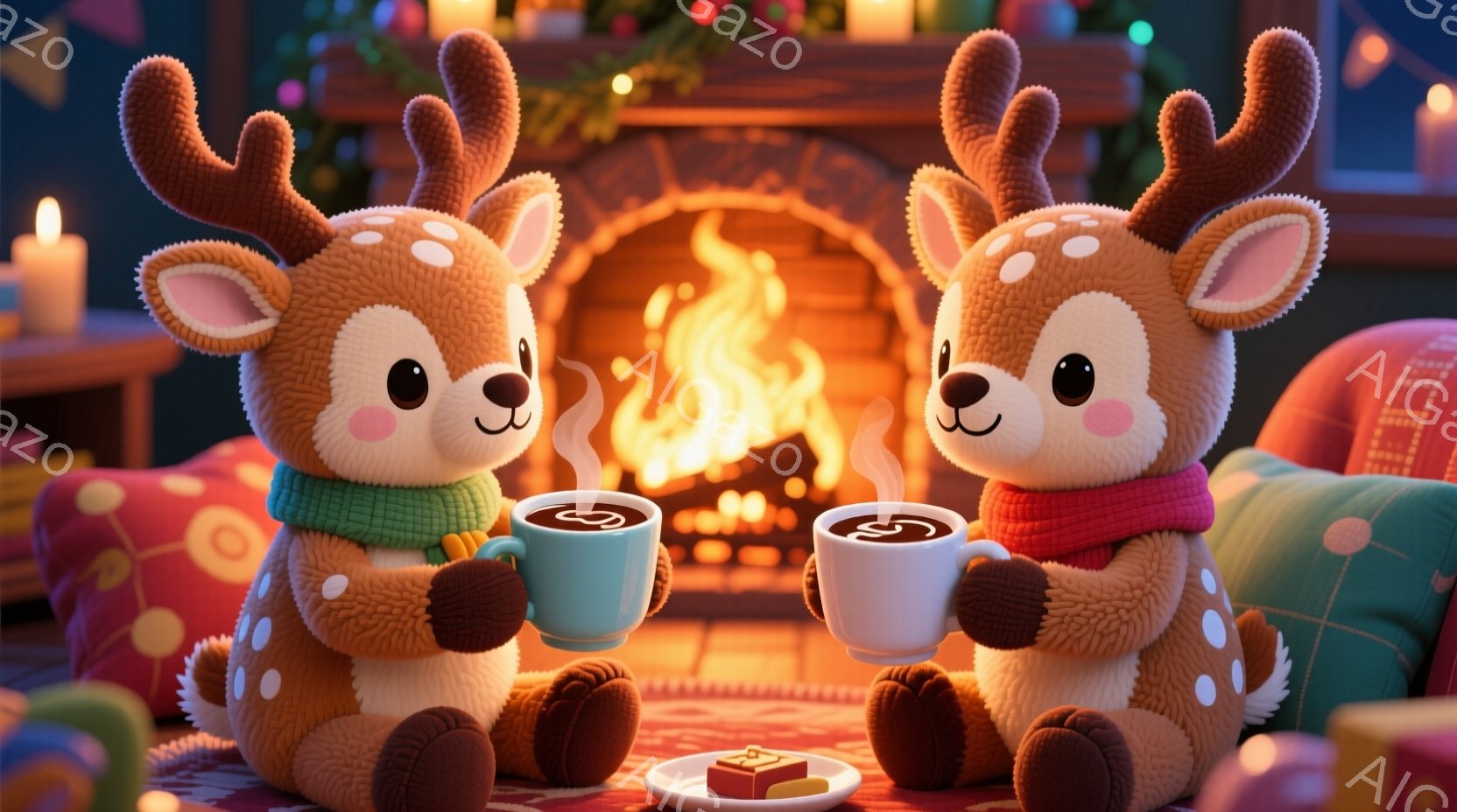 ふわふわした子鹿のキャラクターが2匹、暖炉の前で寄り添って座っています。それぞれ赤いリボンと緑のリボンを首に巻き、ホットチョコレートのような温かい飲み物を手に持っています。背景には、本棚、キャンドル、暖かい色のラグがあり、クリスマスの雰囲気を感じさせる、居心地の良い冬のシーンです。