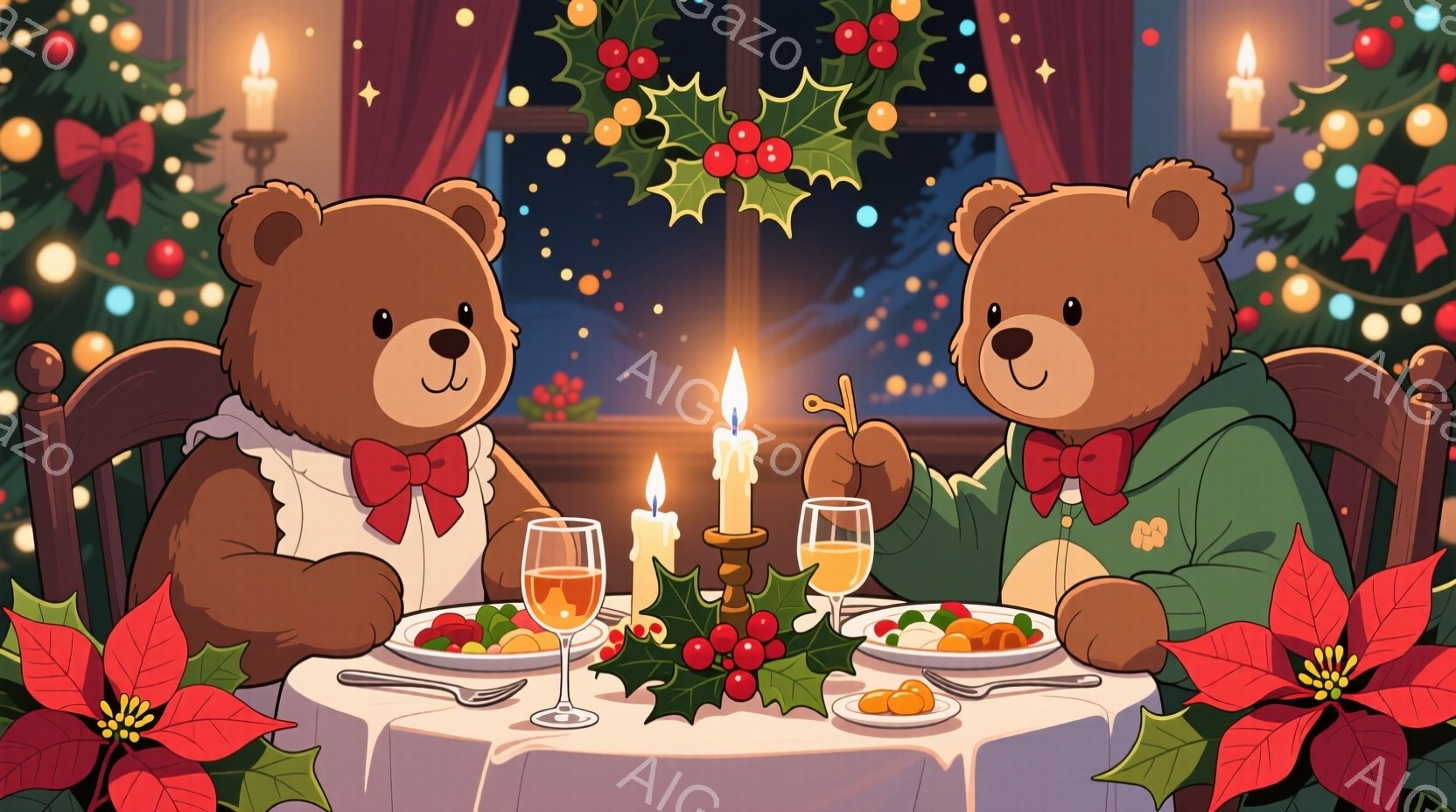 三匹のテディベアがクリスマスディナーを楽しんでいます。赤いリボンと葉っぱの飾りを付けたベアたちは、キャンドルと料理が並んだテーブルを囲んで座っており、それぞれ皿に盛られた料理を見つめています。背景にはクリスマスツリーや装飾が施された窓があり、暖かく、お祝いムードに満ちた雰囲気です。