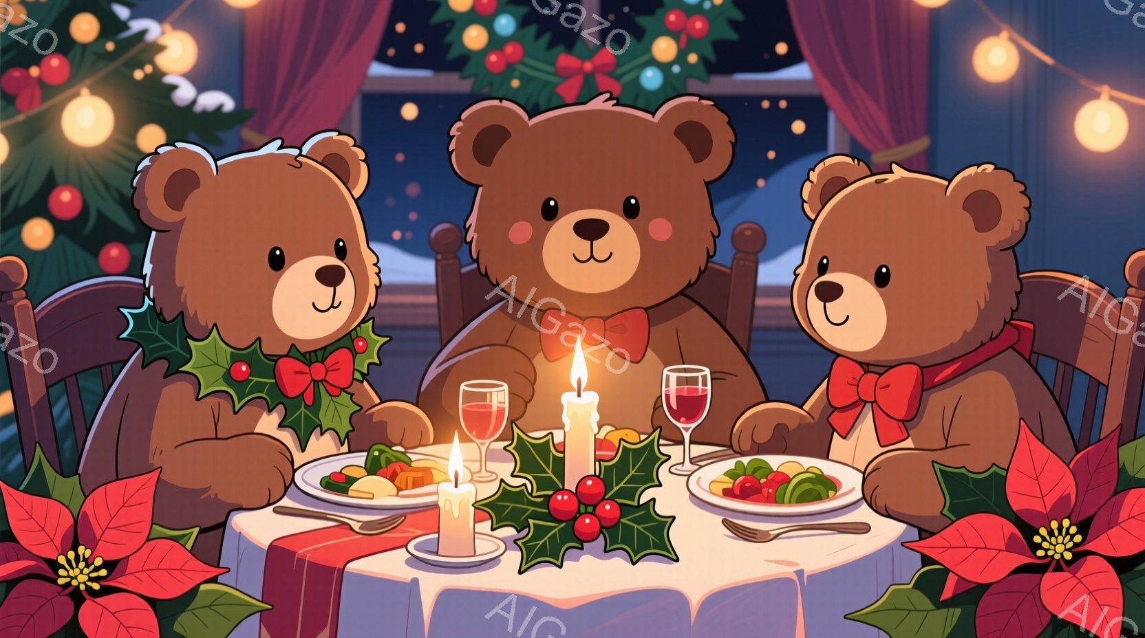 二匹のテディベアがクリスマスのディナーを楽しんでいます。それぞれ赤いリボンを付けた緑のセーターを着ており、テーブルにはローストチキンや付け合わせが並べられたお皿とワイングラスが置かれています。背景には雪景色が見え、窓辺にはクリスマスリースが飾られ、温かくロマンチックな雰囲気が漂っています。