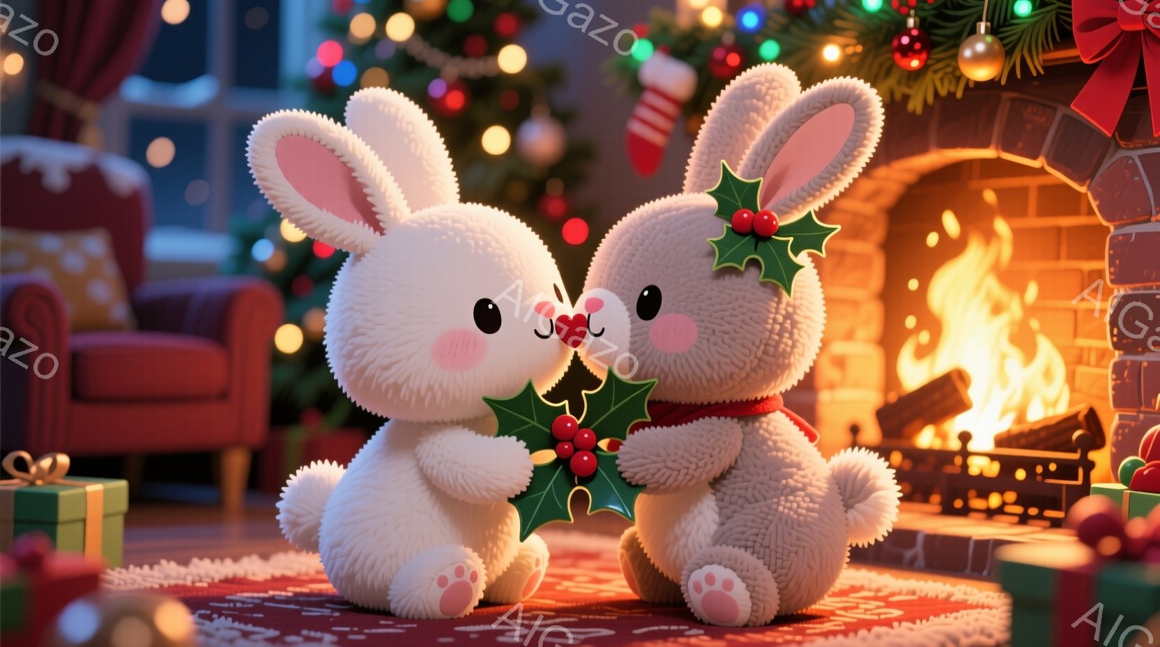 ふわふわの白い子ウサギが寄り添い、クリスマスの飾り付けられた暖炉の前で鼻を触れ合っています。それぞれ赤いリボンと葉っぱの飾りをつけており、丸い頬と輝く瞳が愛らしい表情を作り出しています。背景にはプレゼントやクリスマスツリー、暖炉の火が暖かく、居心地の良い雰囲気を醸し出しています。