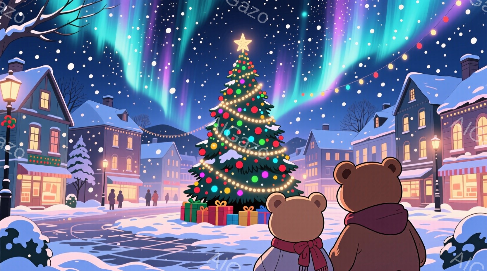 広場の中央には、色とりどりのオーナメントで飾られた大きなクリスマスツリーが立っており、プレゼントボックスが足元に並べられています。二匹のクマのキャラクターが並んでツリーを見上げており、赤いマフラーを巻いて、紺色のパーカーを着ています。背景には、雪で覆われた建物や街灯が並び、夜空にはオーロラのような光が輝き、温かく幻想的なクリスマスの雰囲気を醸し出しています。