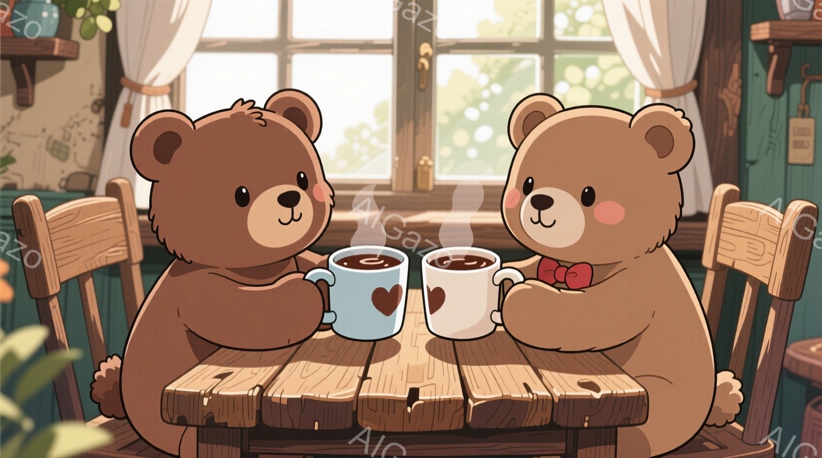 2匹のテディベアがテーブルを挟んで向かい合って座っており、それぞれ手に湯気の立つマグカップを持っています。背景には窓から見える緑豊かな木々があり、室内には木製の家具や植物が配置され、温かくて居心地の良い雰囲気が漂っています。ベアたちは可愛らしい表情で、リラックスした時間を過ごしている様子が伺えます。