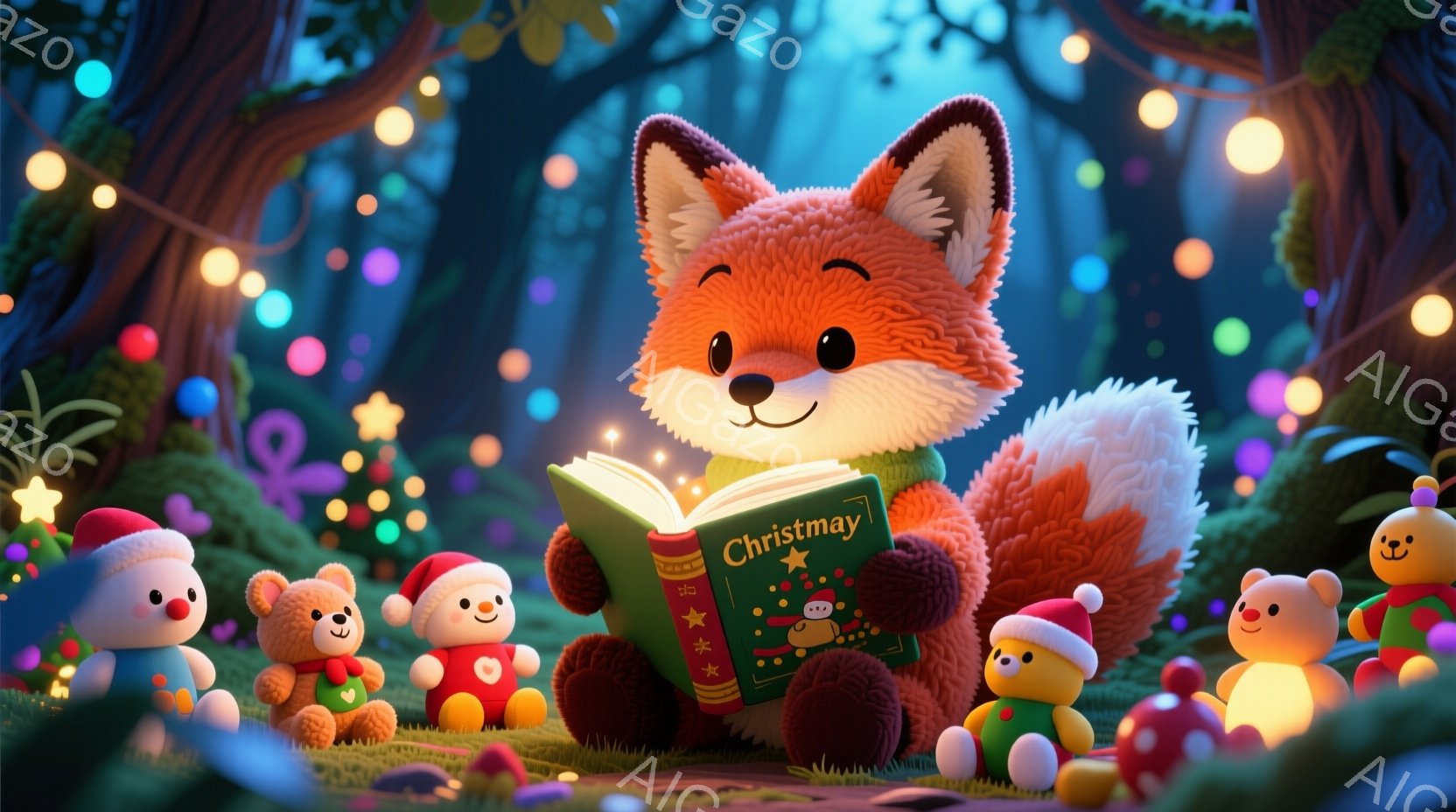 鮮やかな緑の芝生の上に、毛皮のオレンジ色のキツネが座って本を読んでいます。周りには可愛らしいテディベアたちが集まり、キツネは優しい表情で物語の世界に浸っています。背景は暗い森で、色とりどりの光が輝き、まるで夢のようなクリスマスの雰囲気を醸し出しています。