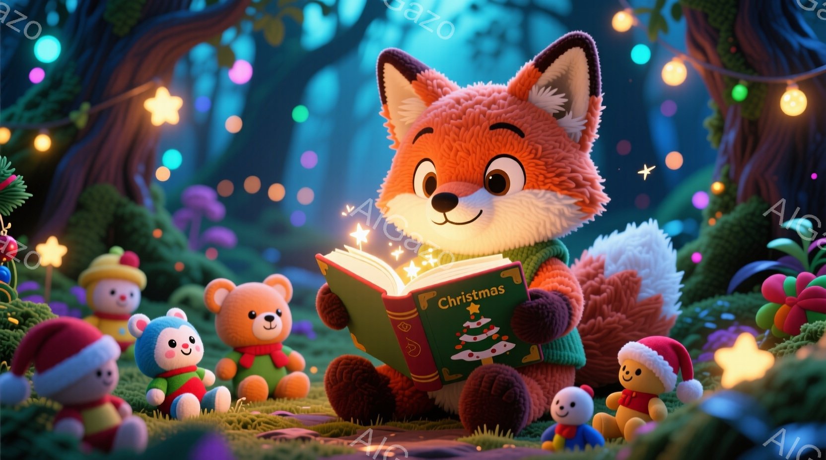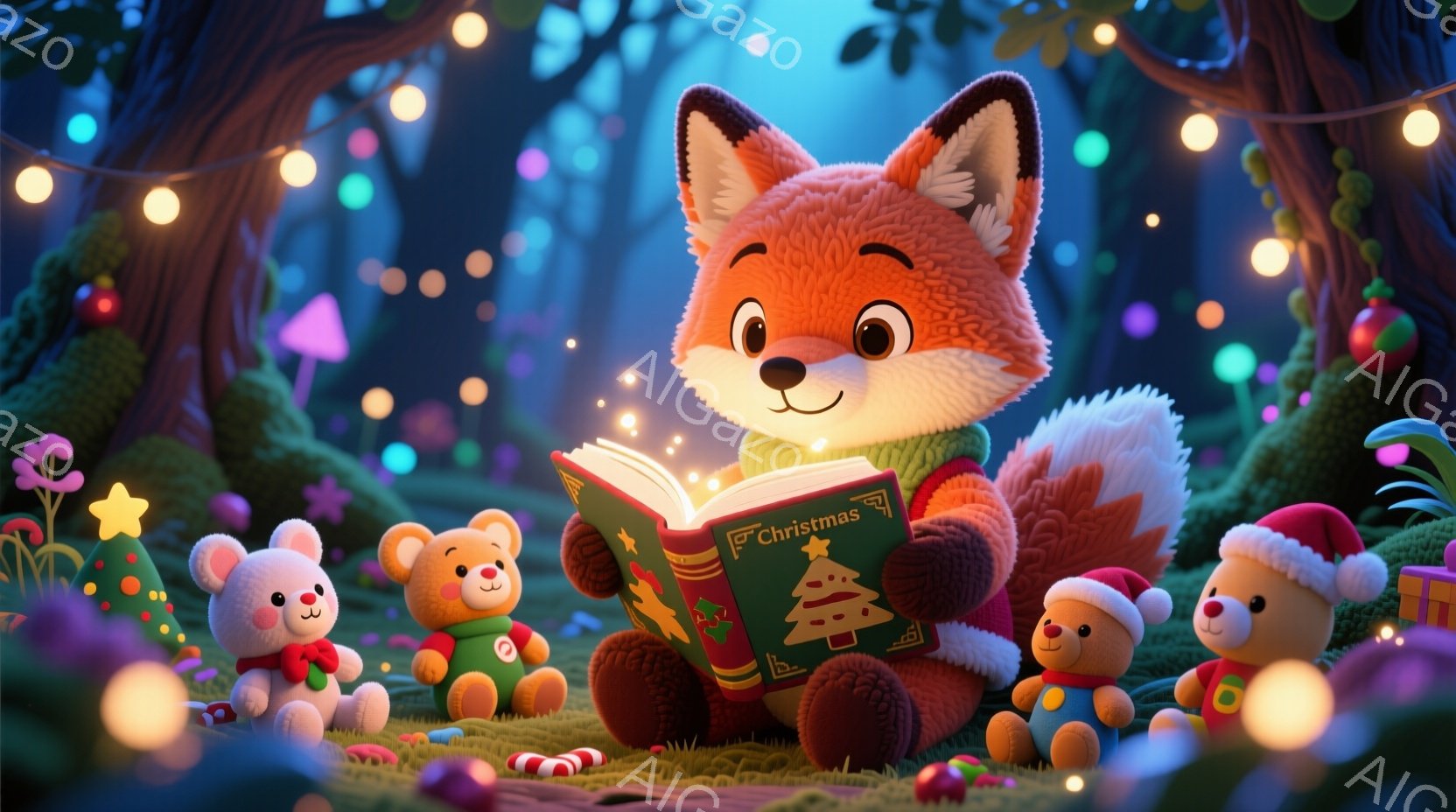 鮮やかな背景の中で、オレンジ色のキツネが緑の草の上に座り、緑色の表紙の絵本を熱心に読んでいる。キツネの周りには、クリスマスツリーの飾りやプレゼント、そして小さなテディベアの人形たちが集まり、祝祭的な雰囲気を醸し出している。背景にはぼやけた木々とカラフルな光が散りばめられ、夢のような温かい世界観を作り出している。