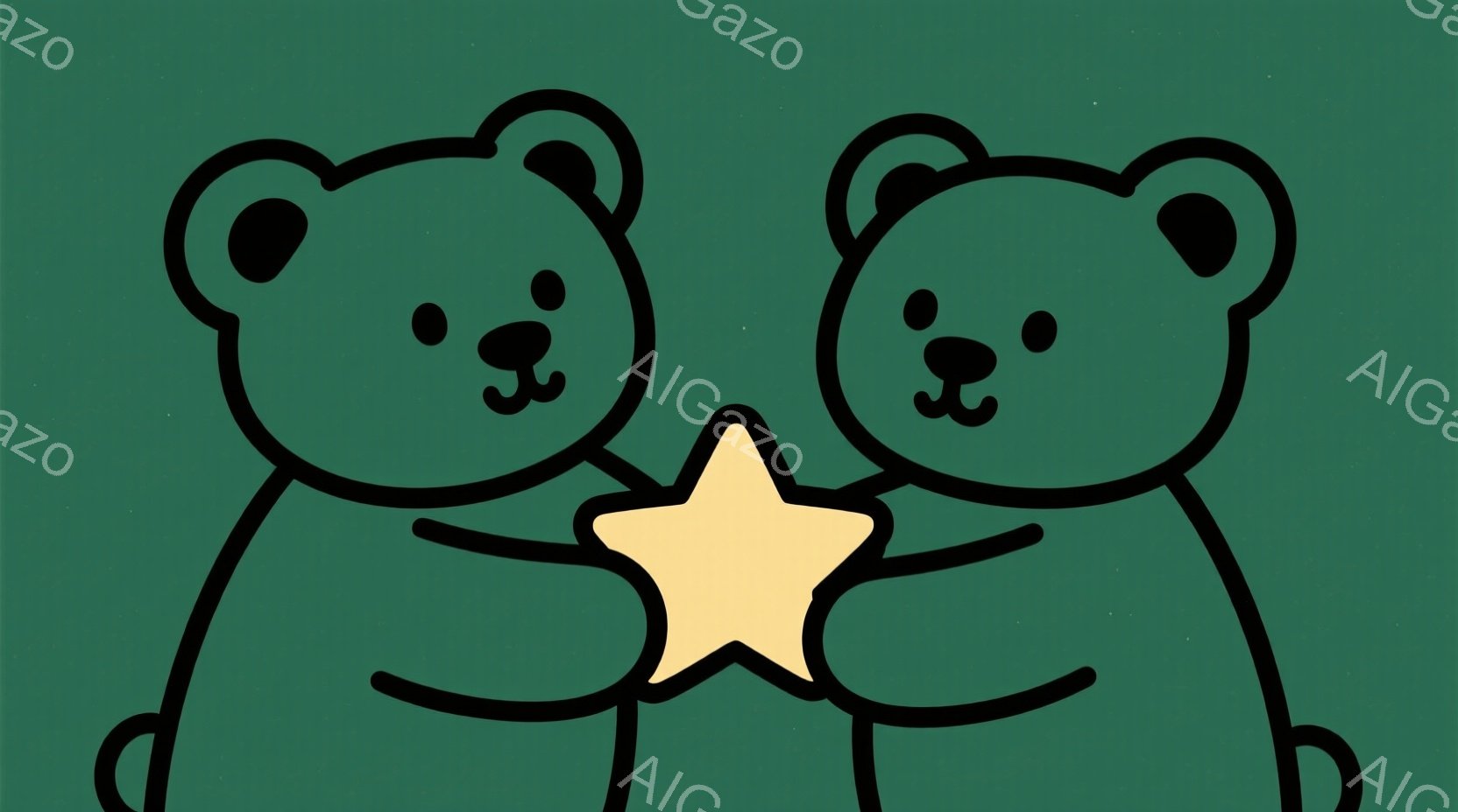 白いクマのキャラクターが2匹、金色の星を両手で抱えています。クマたちは丸みを帯びたフォルムで、愛らしい表情をしています。背景は濃い緑色で、シンプルながらも温かみのある雰囲気を醸し出しています。
