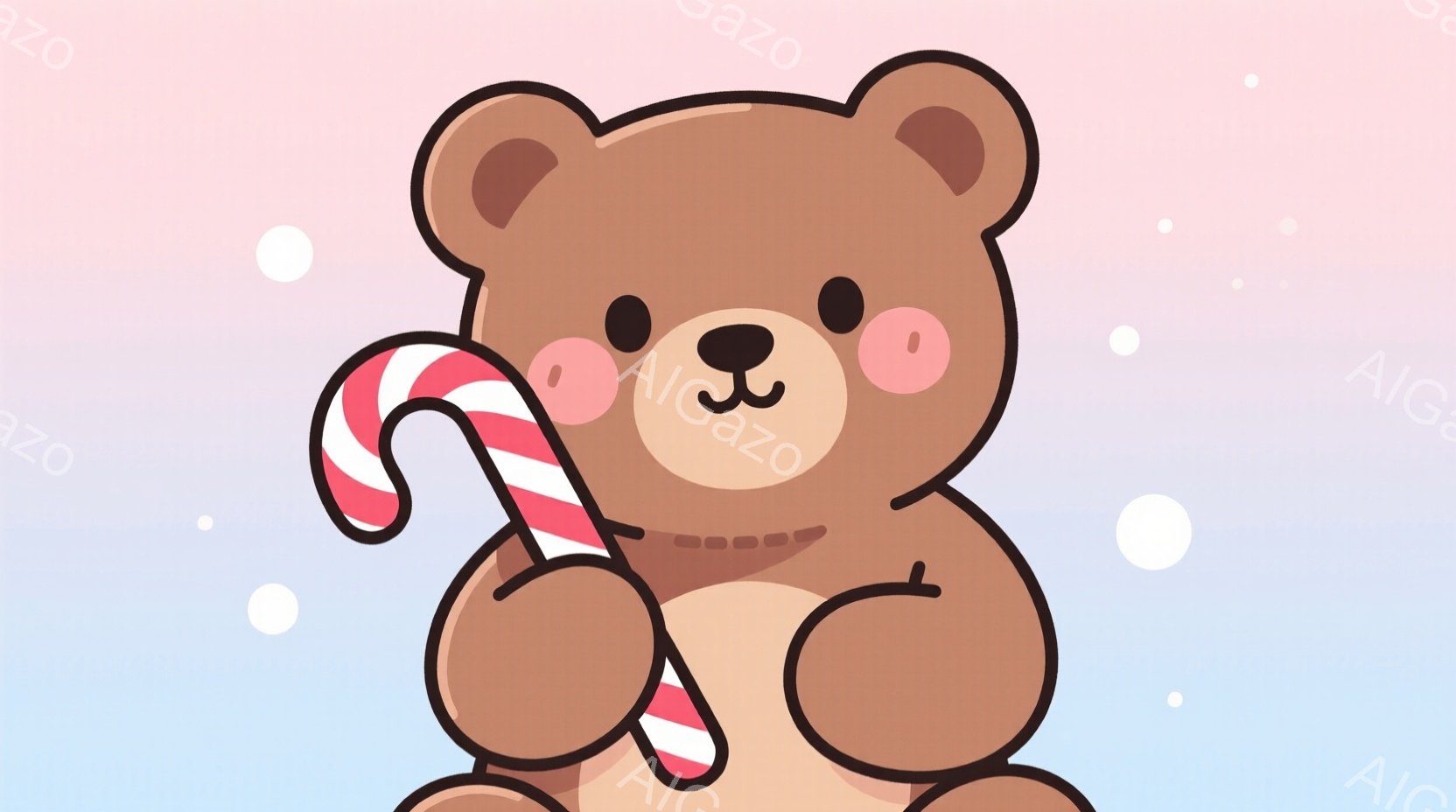 暖かく優しい茶色のクマが、ピンクと水色のグラデーションの背景に描かれています。クマは片方の手で赤いキャンディケーンを持って座っており、つぶらな瞳とふっくらとした頬が愛らしい表情をしています。背景には白く小さな星のようなものが散りばめられ、全体的に柔らかく可愛らしい雰囲気を醸し出しています。