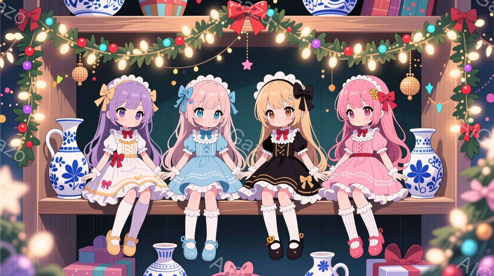 クリスマス装飾が施された棚の上に並んだ四人の少女が描かれています。それぞれ異なる色の可愛らしいドレスを身に着け、頭にはリボンや帽子が飾られ、明るい表情で座っています。背景にはプレゼントボックスや装飾品が配置され、華やかで温かいクリスマスの雰囲気が漂っています。