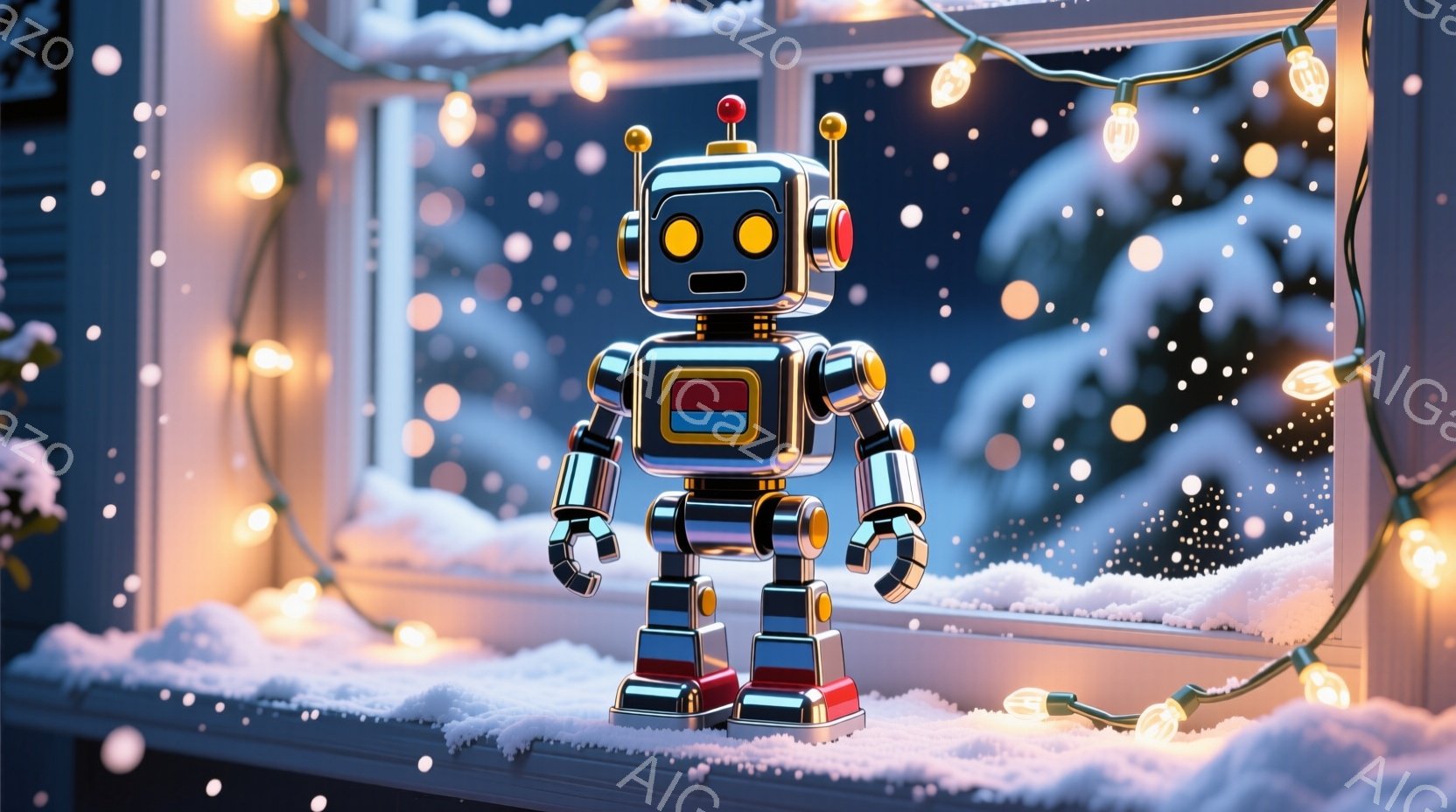 窓枠に銀色のロボットが立っており、頭部には青いディスプレイが組み込まれ、目は明るいオレンジ色です。背景には雪が降り積もり、ぼやけた建物と木々が見え、温かい光のイルミネーションがロボットの周りを彩っています。全体的に、冬の穏やかで幻想的な雰囲気が漂っています。