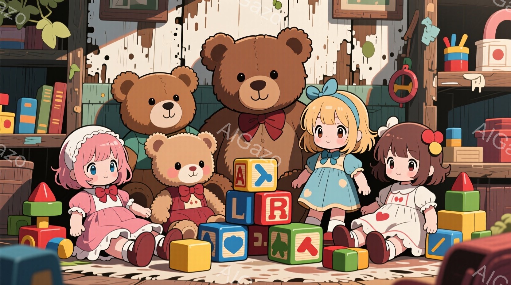 可愛らしい人形たちが、大きなテディベアを中心に座って並んでいます。赤いワンピースを着た人形たちは、茶色や黒の髪に結び目をつけており、明るい笑顔を見せています。背景には、カラフルな積み木や木製の床があり、暖かく、おもちゃでいっぱいの部屋の雰囲気が漂っています。