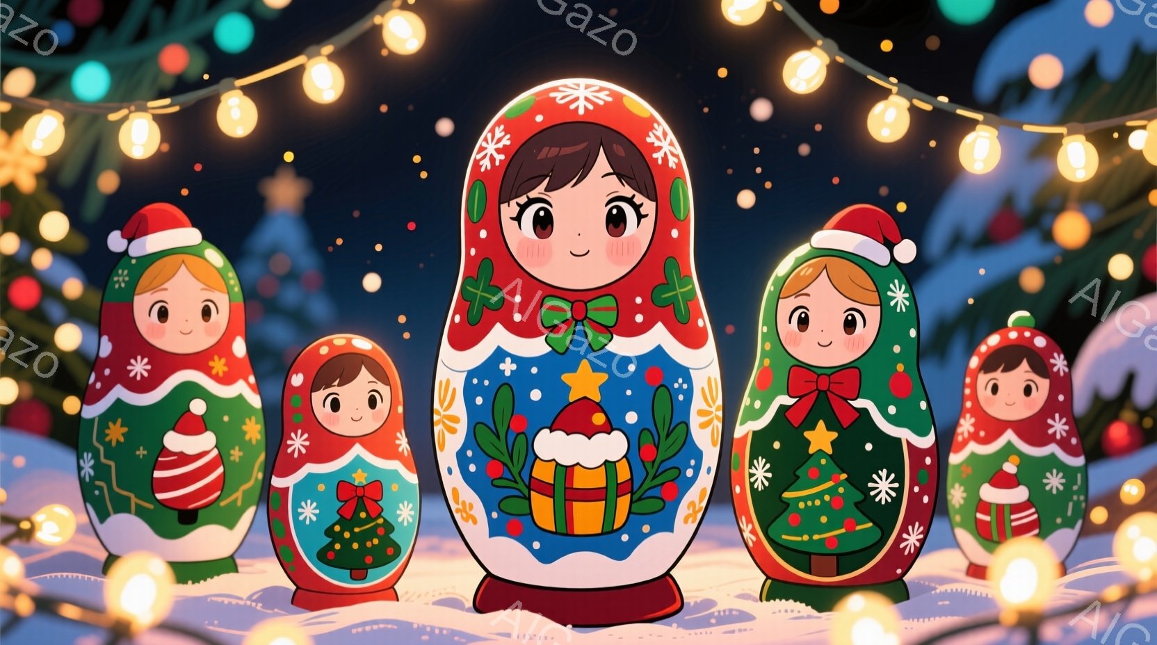 クリスマスの装飾が施されたマトリョーシカ人形が並んでいます。人形たちはそれぞれ赤い帽子をかぶり、緑や青の装飾が施された冬の衣装を着ています。背景には雪景色とキラキラと輝く光が描かれており、温かくお祝いムードに満ちた雰囲気を醸し出しています。