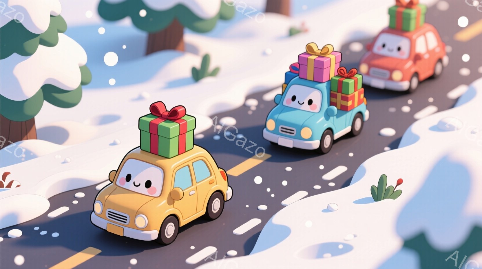 雪景色の中に、プレゼントを積んだ可愛らしい車が並んでいます。緑、黄色、赤色の車はそれぞれ笑顔で、まるでクリスマスのお祝いに向かっているかのようです。背景には雪に覆われた木々があり、全体的に温かく、お祭り気分を醸し出しています。