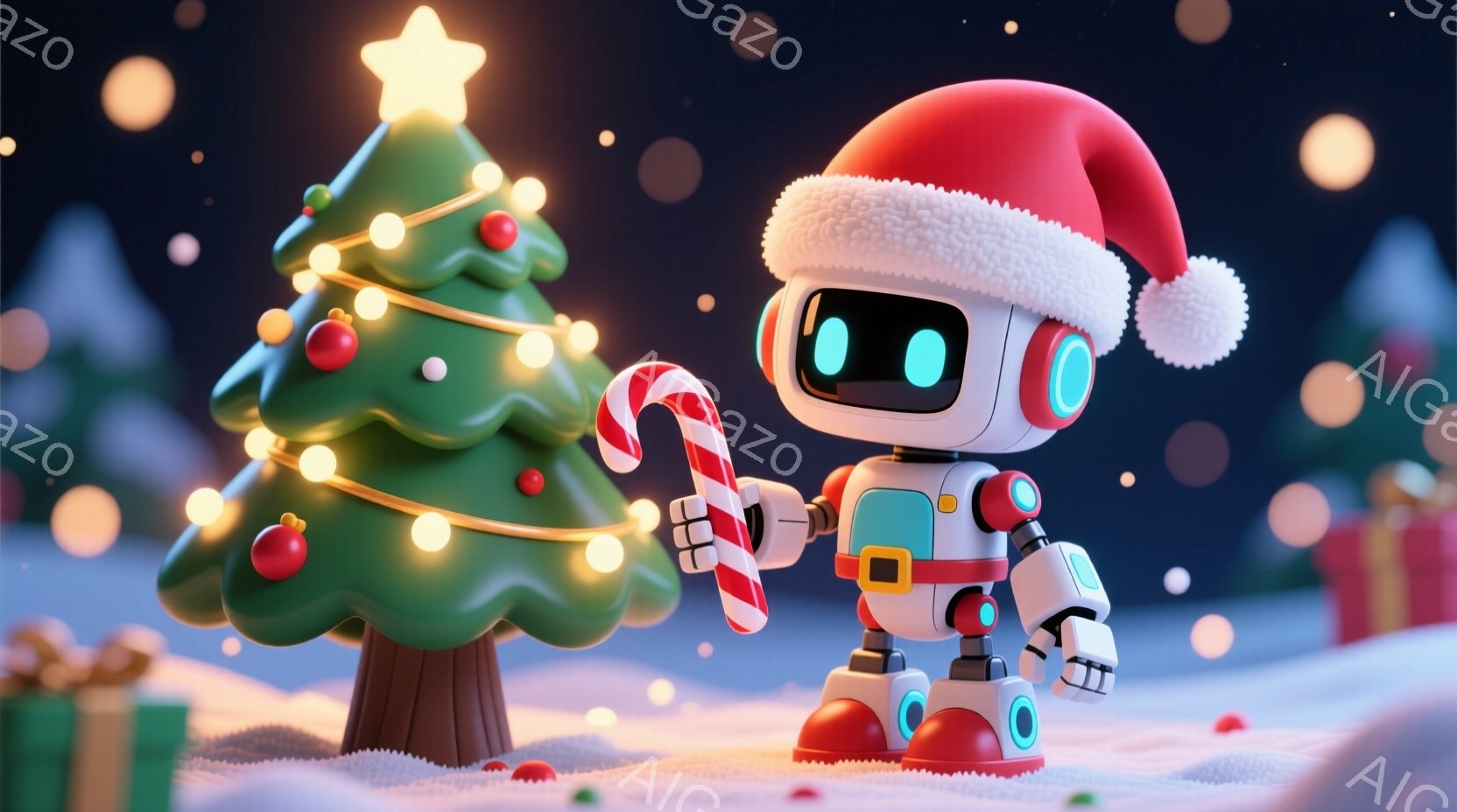 白い雪景色の中に、サンタ帽をかぶったロボットが立っています。ロボットは片手にキャンディケーンを持ち、明るい表情でこちらを見ているようです。背景にはクリスマスツリーやプレゼントボックス、そして可愛らしい建物が並び、温かく楽しいクリスマスの雰囲気が漂っています。