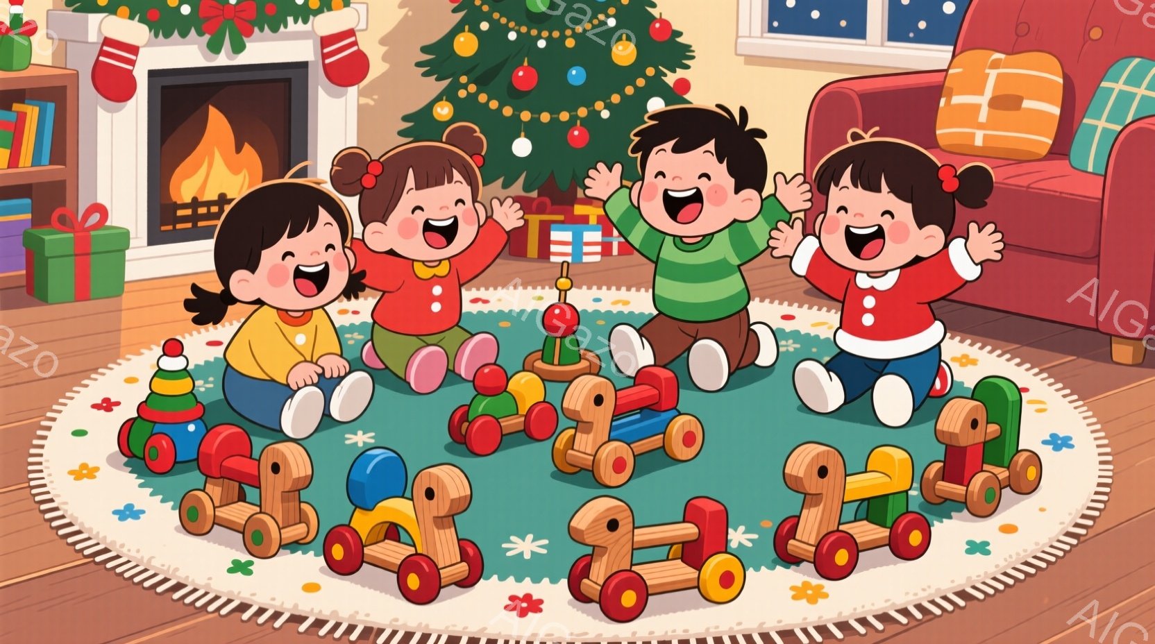 4人の子供たちが円形のラグの上で木製の玩具で遊んでいます。彼らはそれぞれ異なる色の服を着ており、皆笑顔で、楽しそうに遊んでいます。背景にはクリスマスツリーとプレゼント、そして暖炉が見え、全体的に温かく幸せな雰囲気が漂っています。