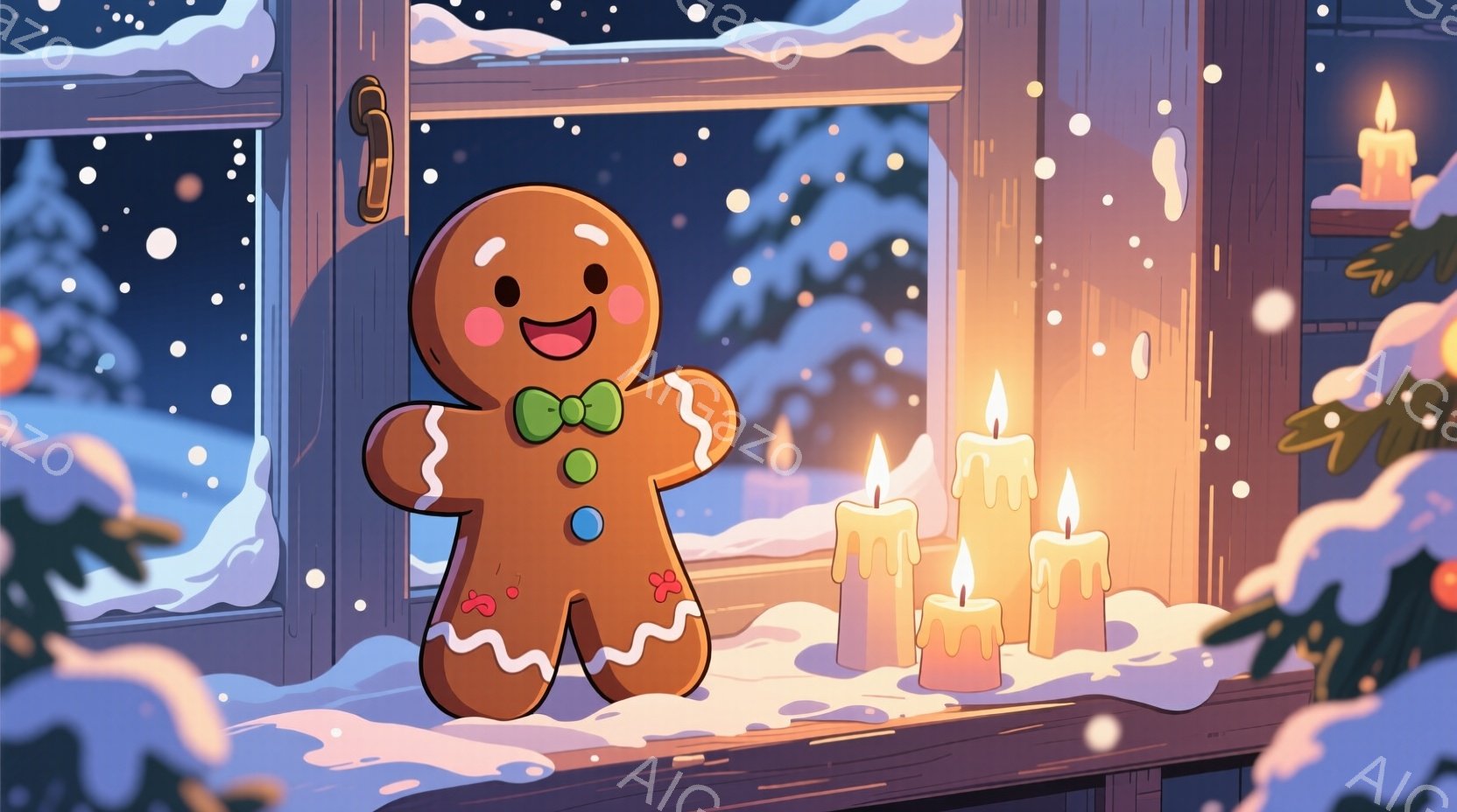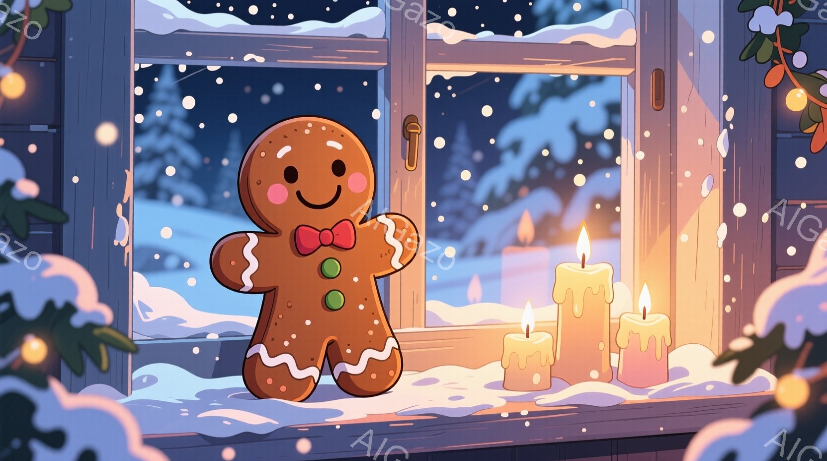 ジンジャーブレッドマンが雪景色を背景に窓辺に立っている。彼は赤いリボンと緑のボタンを身に着け、笑顔で両手を広げている。外は雪が降り積もり、ぼんやりとした光の点と、窓枠に飾られた赤い実が冬の暖かく心地よい雰囲気を醸し出している。