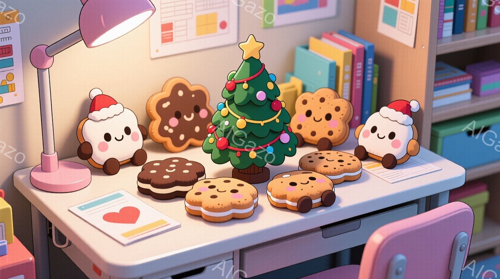 机の上に、様々な種類のクッキーがかわいく並んでいます。クリスマスツリーの形のクッキーもあり、まるで小さなクリスマスパーティーのようです。背景には本棚やランプがあり、暖かく穏やかな雰囲気が漂っています。
