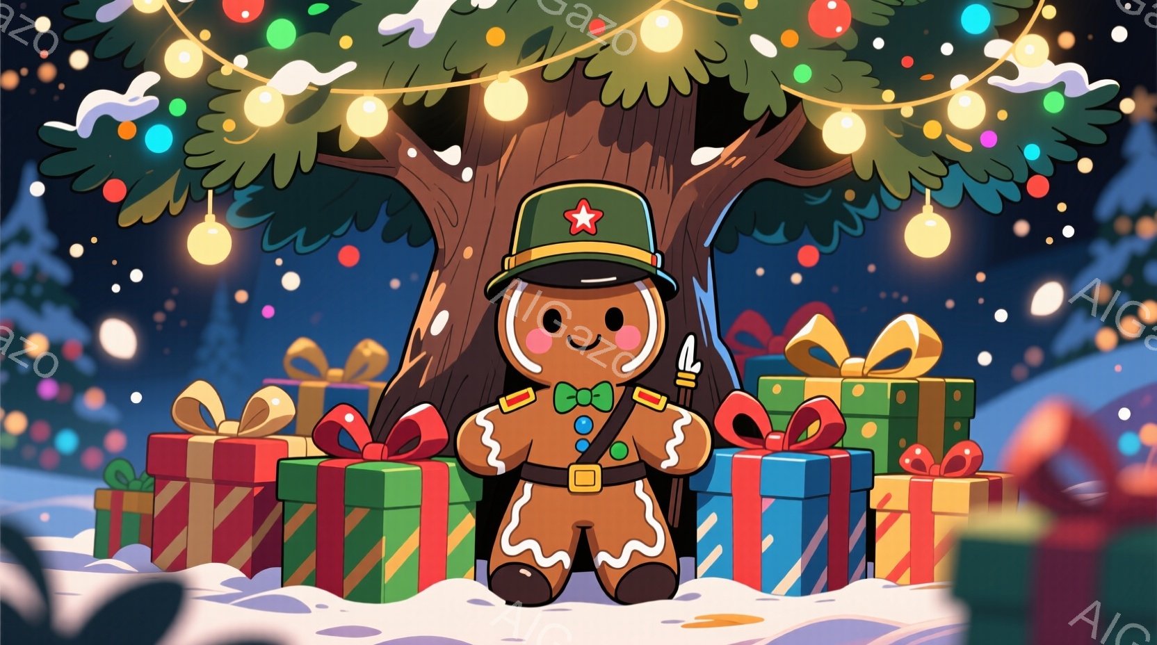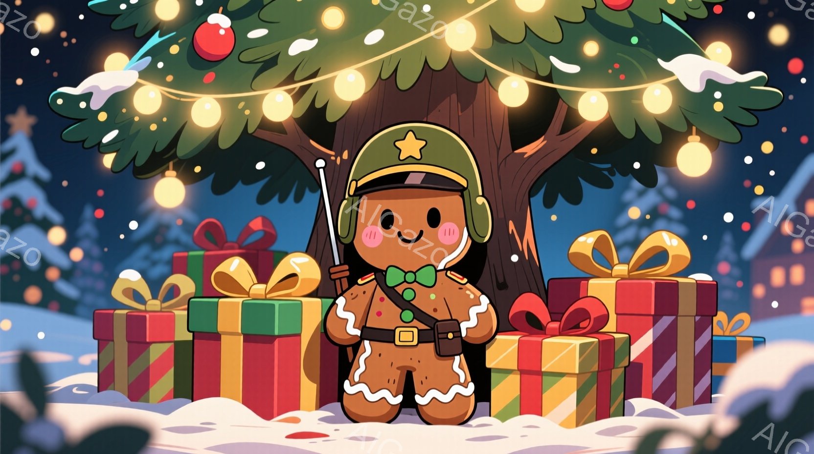 生姜焼きクッキーのような姿をしたキャラクターが、プレゼントの山に座っています。緑色の帽子に赤い星飾り、赤いリボン、そして茶色と白の模様が特徴的で、微笑みを浮かべています。背景には雪景色と、輝く電飾で飾られたクリスマスツリーがあり、温かく楽しい雰囲気が漂っています。