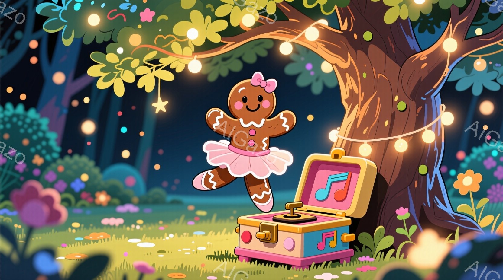 人型のジンジャーブレッドクッキーが、ピンクのチュールスカートを身につけ、片足を上げてバレエのポーズをとっています。背景には、音楽が流れるレトロなラジオと、緑豊かな草地、木々、そしてきらめく光が散りばめられた夜の風景が広がっています。全体的に、かわいらしく、夢のような、おとぎ話のような雰囲気が漂っています。