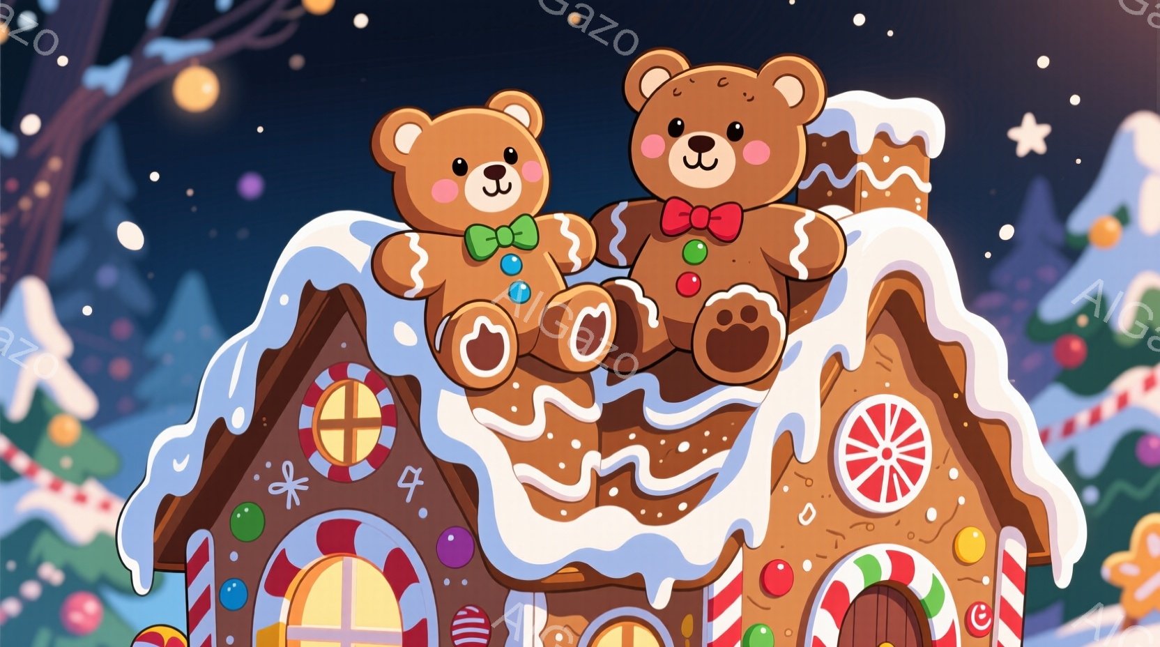 クリスマスをテーマにしたイラストで、ジンジャーブレッドハウスの屋根の上に2匹のテディベアが座っています。テディベアはそれぞれ赤いリボンをつけており、可愛らしい表情をしています。背景には、クリスマスツリーやカラフルなガーランドが見え、雪が舞う暖かく楽しい雰囲気が漂っています。