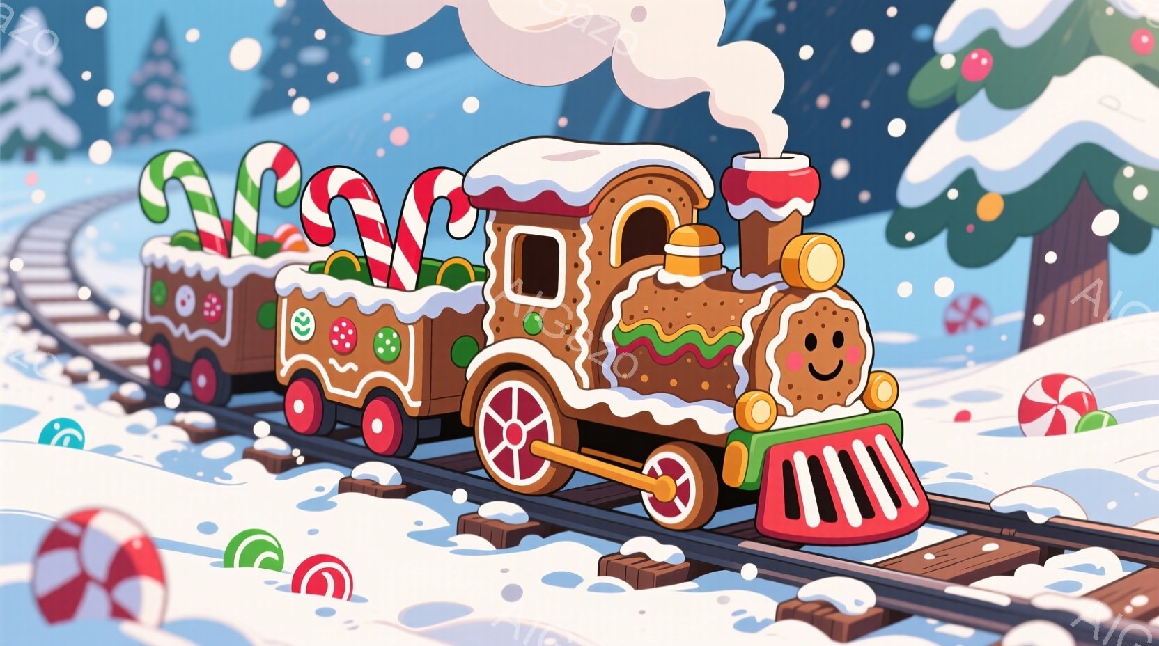 ジンジャーブレッドで作られた列車が雪の積もった線路を走っています。列車はキャンディケーンやカラフルなアイシングで飾られ、まるで物語に出てくるお菓子の国から飛び出してきたかのようです。背景には雪に覆われた木々と、雪が舞う冬の風景が広がっています。