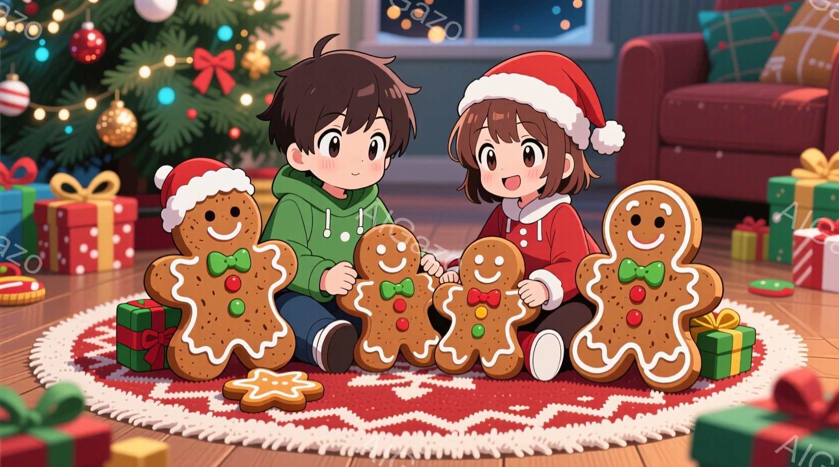 暖炉のそばのラグの上で、クリスマスツリーの周りにプレゼントが置かれた部屋で、3人の女の子がジンジャーブレッドクッキーを持って座っています。3人とも赤いサンタ帽をかぶり、緑や赤の冬らしい服装をしています。笑顔で、楽しそうな雰囲気でクッキーを見つめています。