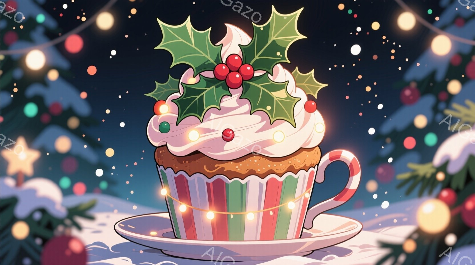 クリスマスをテーマにしたカップケーキが白い皿の上に置かれています。カップケーキはクリームとホーリーで飾られており、ペパーミントキャンディの取っ手が付いた紙製のカップに入っています。背景にはぼやけたクリスマスツリーやプレゼント、そして輝く光が散りばめられており、お祝いムードを演出しています。