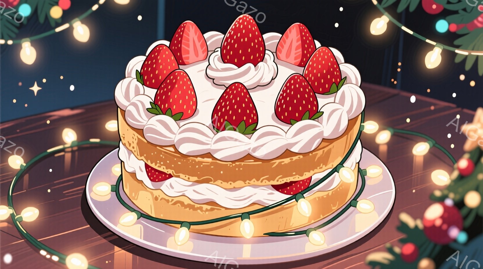 イチゴとクリームをたっぷり使ったショートケーキが描かれています。ケーキは白いお皿に乗っており、背景には点滅するイルミネーションが散りばめられています。全体的に温かく、お祝いの雰囲気が漂う、美味しそうなケーキの写真です。