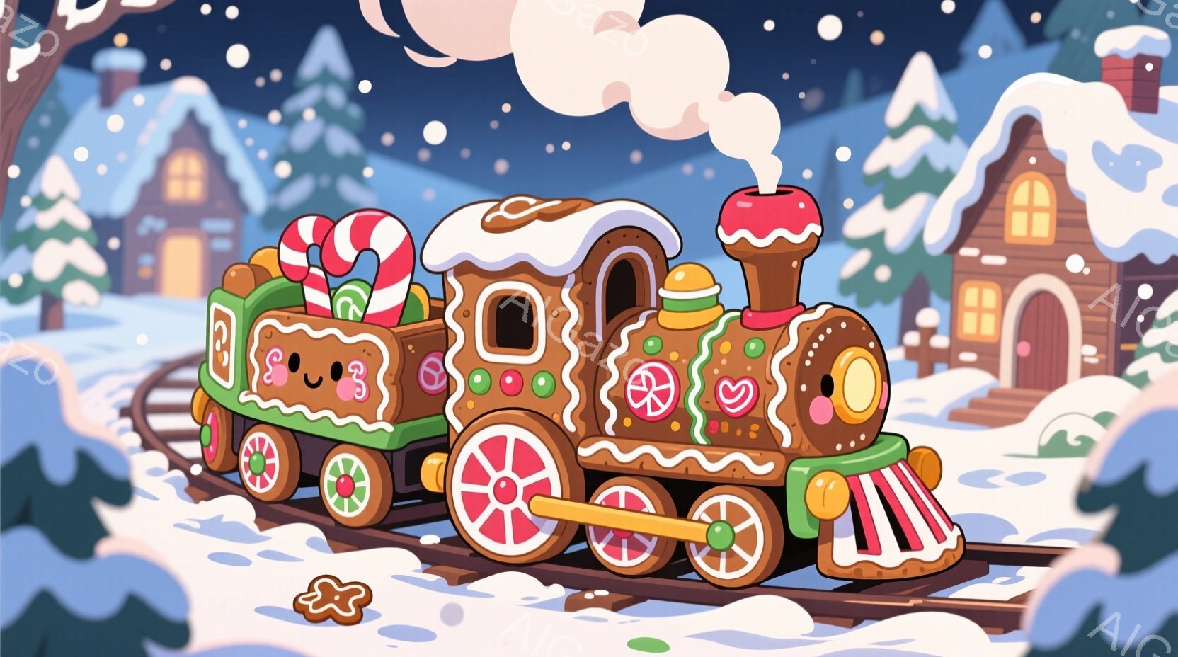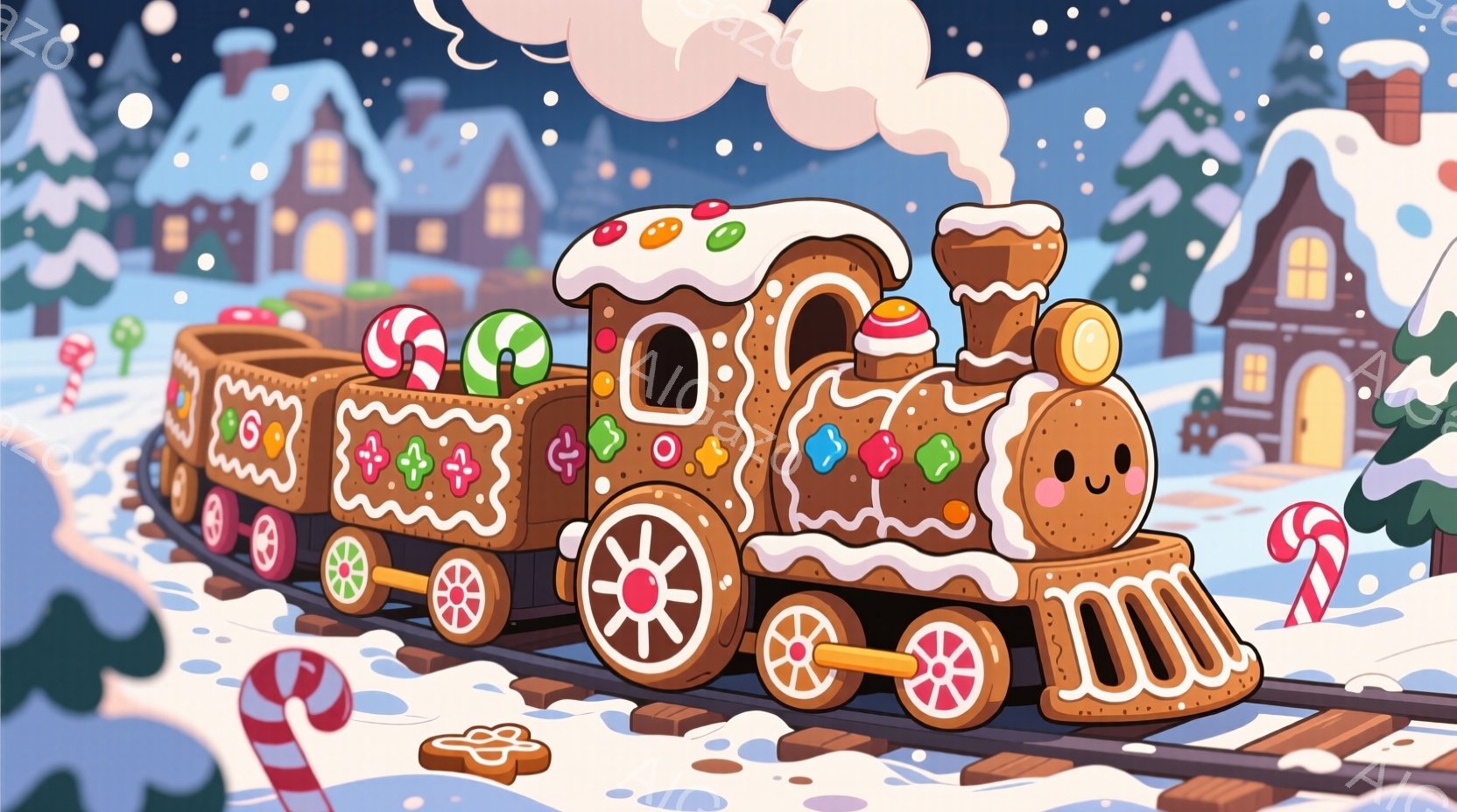 暖炉から立ち上る煙のように、雪景色の中をジンジャーブレッドで作られた列車が走っています。列車はキャンディやクッキーで飾られ、可愛らしい表情をしており、背景には雪で覆われた屋根の家々が並び、クリスマスの温かく楽しい雰囲気を醸し出しています。全体的に、お菓子の家や雪景色が、冬の魔法のような世界観を表現しています。