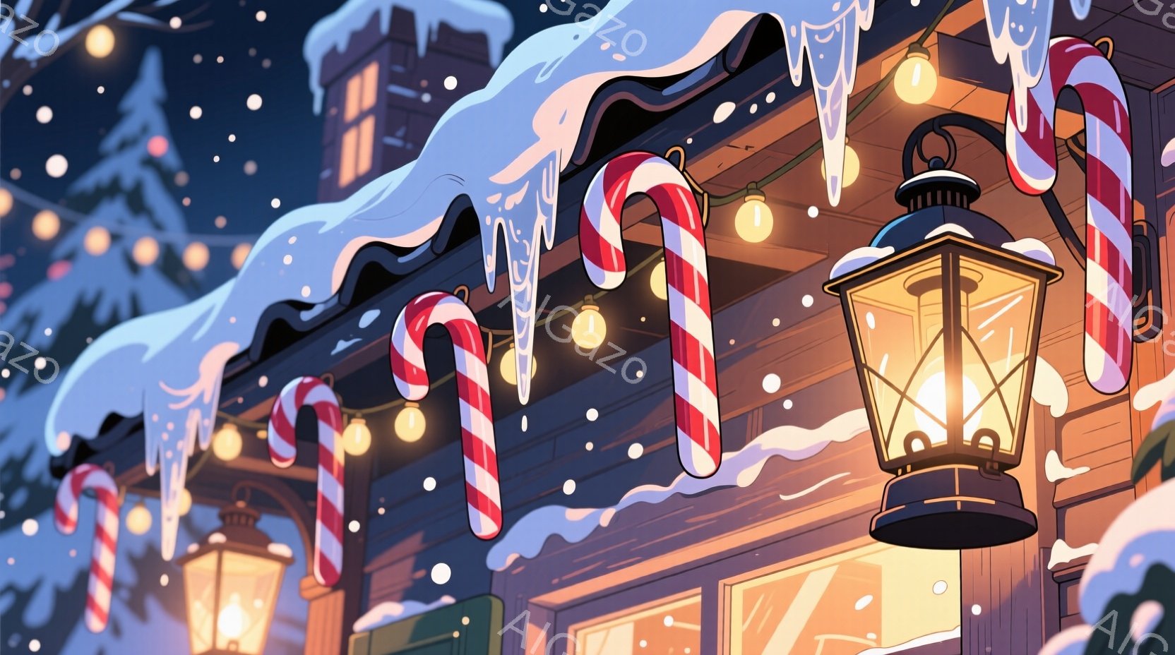 雪が降る夜、家の屋根に装飾が施されています。カラフルなキャンディケーンと暖かい光を放つランタンが雪に覆われた屋根に沿って並び、冬の暖かく心地よい雰囲気を醸し出しています。緑色の壁と窓からは柔らかな光が漏れており、クリスマスの祝祭感を高めています。
