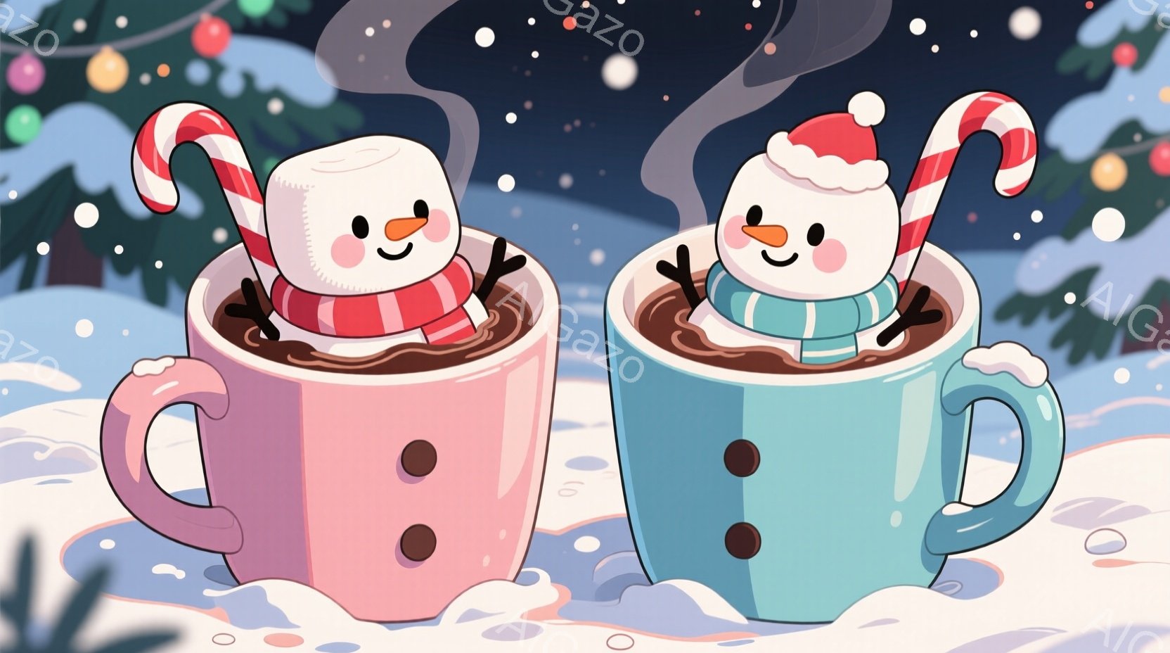 可愛らしい雪だるまが、それぞれピンクと水色のマグカップの中で、ホットココアに浸かって楽しんでいます。雪だるまは、それぞれ赤いキャンディケーンとマフラーを身につけ、笑顔を見せています。背景には雪が降り積もり、遠くには緑色の木々が見え、温かく、幸せな冬の雰囲気を醸し出しています。