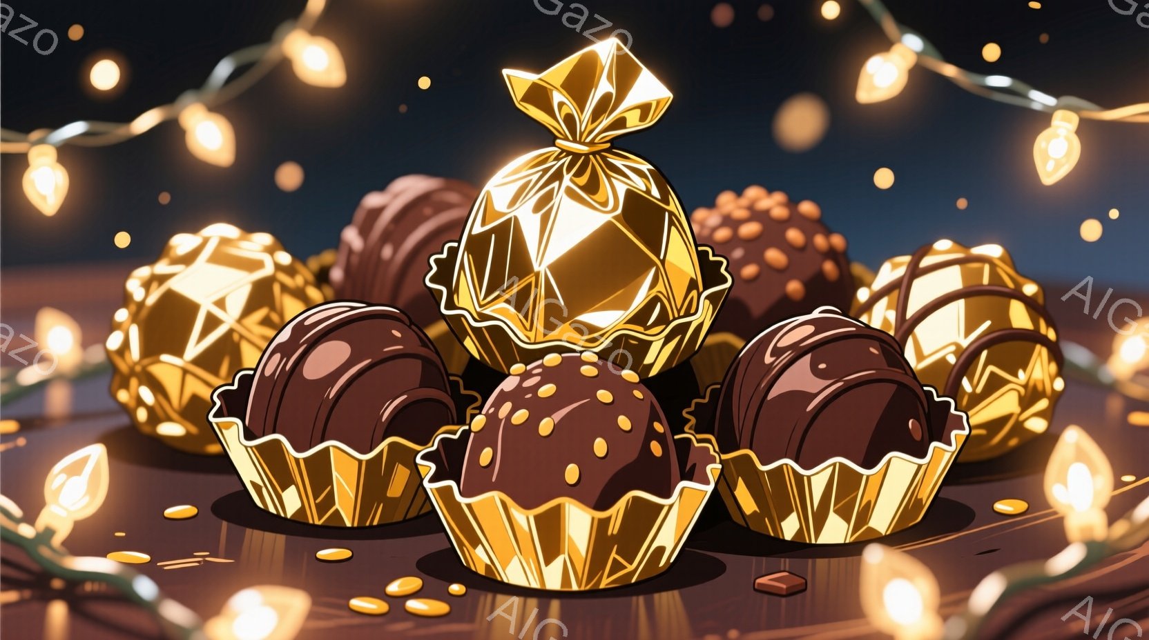 チョコレートが紙製の金色のカップに入って白い皿に並べられています。背景にはぼやけた金色の光が散りばめられ、お祝いや特別な日の雰囲気を醸し出しています。チョコレートは深みのある茶色で、光沢があり、食欲をそそるように見えます。