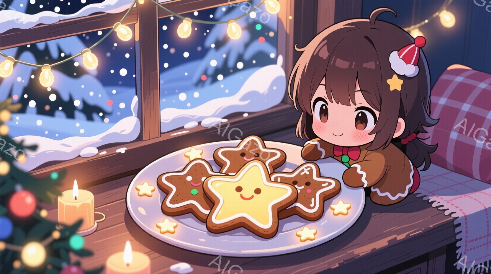 茶髪の少女が窓辺に座り、クッキーの皿を見つめている。彼女は白いセーターに赤いリボンをつけ、頬を赤らめて幸せそうに微笑んでいる。背景には雪が降る森と、温かい光を放つキャンドルと電飾があり、温かく穏やかなクリスマスの雰囲気が漂っている。