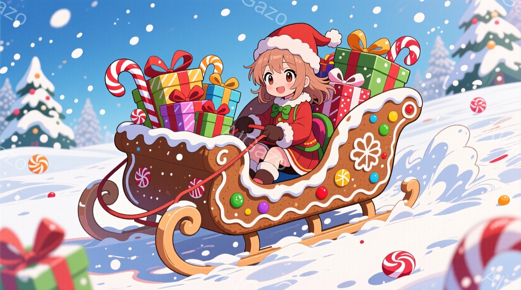 金髪で赤い帽子をかぶった少女が、クッキーのようなそりに乗って雪の中を走っている。彼女は赤いコートとブーツを身につけ、笑顔でそりを操っている。背景には雪に覆われた木々と、カラフルなキャンディケーンやオーナメントが散りばめられており、お祝いムード満載の冬景色が広がっている。