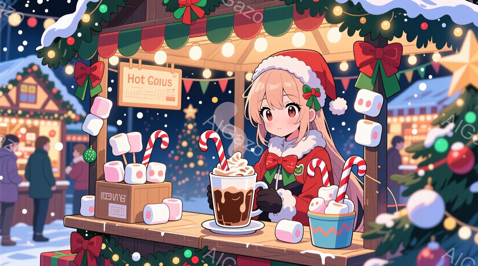 クリスマスマーケットの屋台で温かい飲み物を提供する若い女性が描かれています。彼女は赤いサンタ帽を被り、赤い格子柄のセーターと黒いコートを着ており、笑顔で温かい飲み物を提供しています。背景には雪が降る街並みと、クリスマスツリーや装飾が施された屋台が描かれ、温かくお祭り気分に満ちた雰囲気が漂っています。