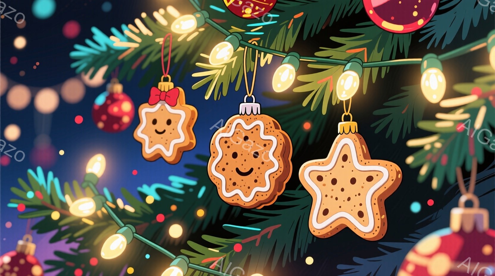 クリスマスツリーの枝に、笑顔のクッキーオーナメントが飾られています。赤いオーナメントボールや色とりどりのイルミネーションライトが、緑の葉と暖かく照らし出し、祝祭の雰囲気を醸し出しています。背景はぼやけていますが、全体的に温かく、楽しげなクリスマスの情景が表現されています。