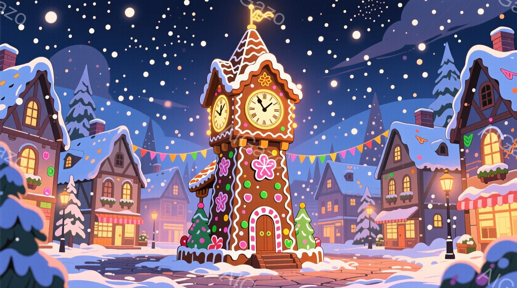 雪が降り積もる幻想的な街並みを捉えています。ジンジャーブレッドハウス風の時計台が中央にそびえ立ち、周囲にはカラフルな家々が並び、夜空には星が輝いています。暖色系の光が街全体を照らし、クリスマスの飾り付けが暖かく、お祝いムードを盛り上げています。