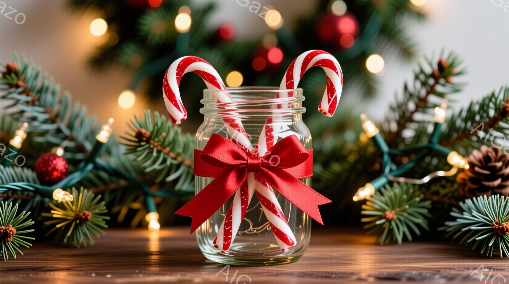 鮮やかな赤いリボンで飾られた透明な瓶の中に、いくつかのペパーミントキャンディが入っています。背景には、光り輝くクリスマスツリーの飾りと、木製のテーブルが写っており、暖かく、お祝いムードを醸し出しています。全体的に、クリスマスの季節感を強調した、静かで美しい光景です。