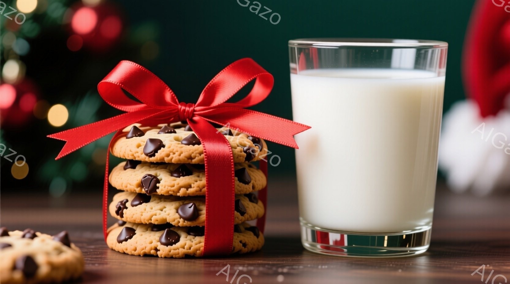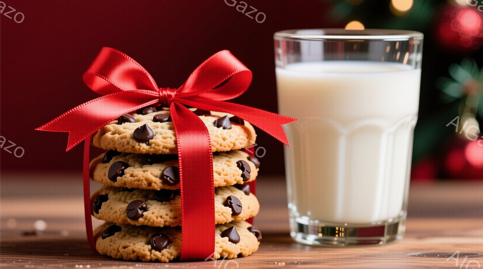 クッキーが赤いリボンで結ばれて積み重ねられ、白いグラスに入ったミルクの隣に置かれています。背景には、緑色のクリスマスツリーと赤いテーブルクロスが見え、クリスマスの温かい雰囲気を醸し出しています。全体的に、ホリデーシーズンの心地よいひとときを表現した静物画です。