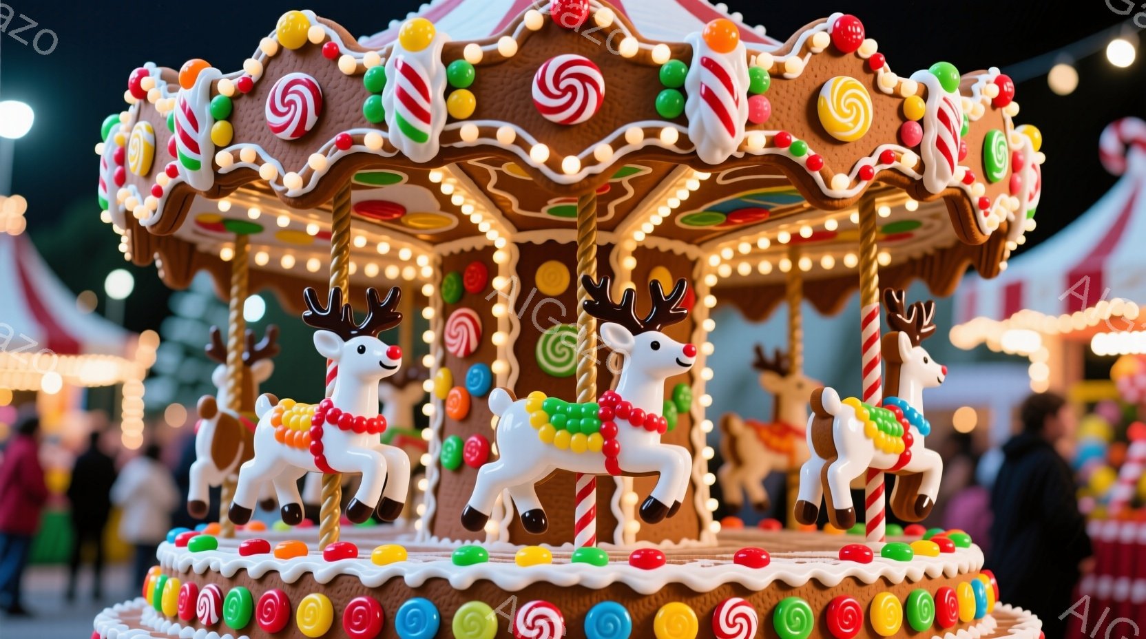 ジンジャーブレッドで作られたメリーゴーランドが写っており、可愛らしい鹿のモチーフが乗り物として配置されている。メリーゴーランドはカラフルなキャンディーやグミで飾られ、全体的に温かかく、お祭り気分を呼び起こすような雰囲気が漂っている。背景には雪景色とぼんやりとした建物のシルエットが見え、冬の魔法のような世界観が演出されている。