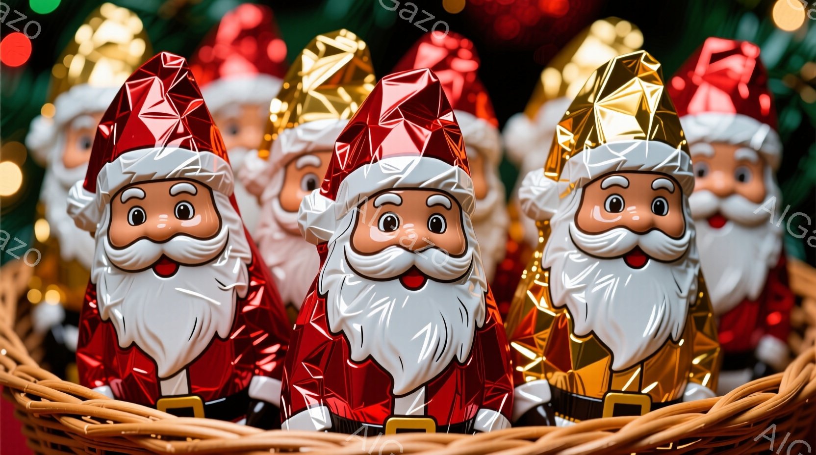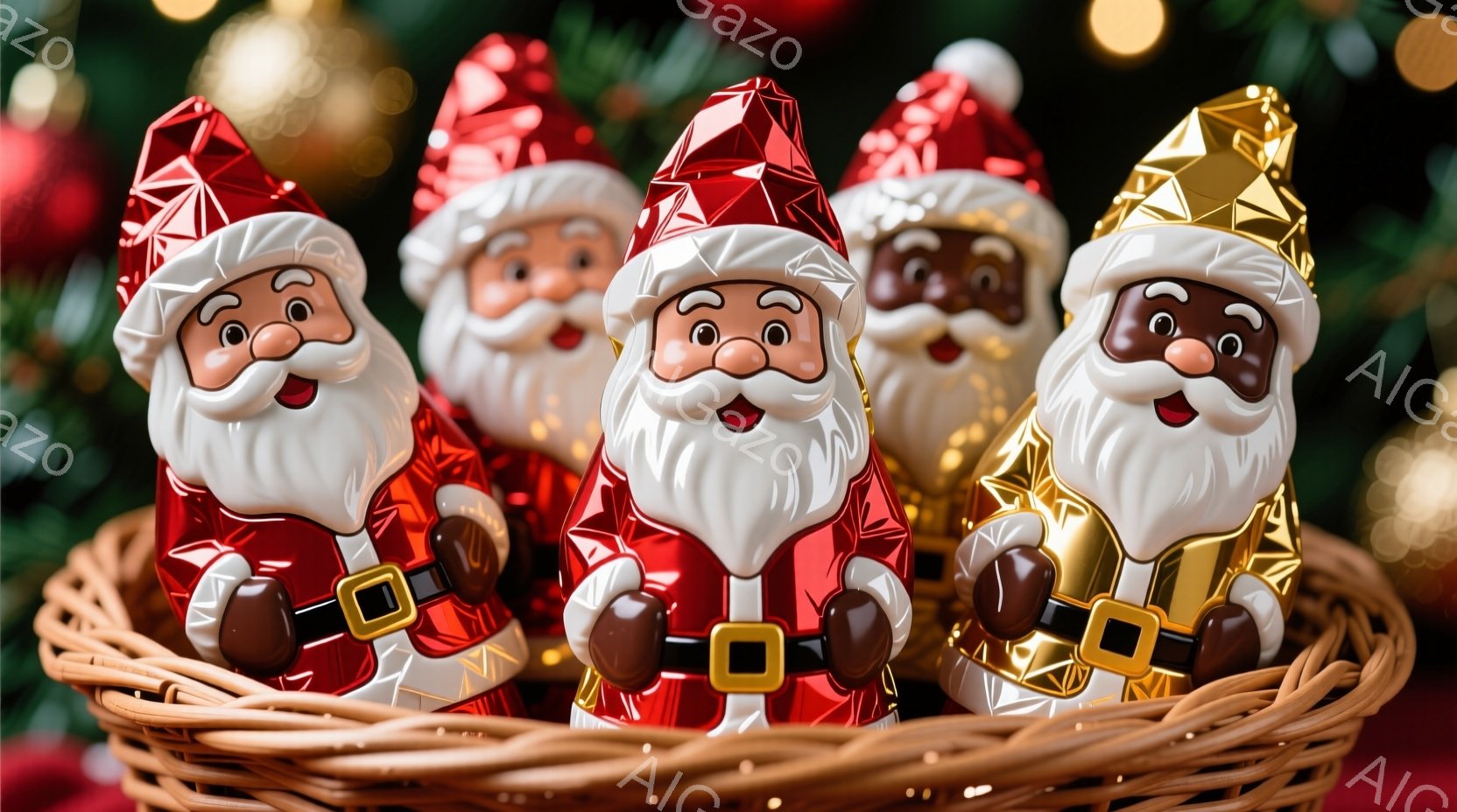 鮮やかな赤い包装紙に包まれたサンタクロースのチョコレートが、編み込まれたバスケットに並んでいます。サンタたちは白いひげと笑顔で、黒いベルトでウエストを締めており、それぞれ少しずつ傾いています。背景にはぼやけた緑色の葉が見え、クリスマスの温かく華やかな雰囲気を醸し出しています。