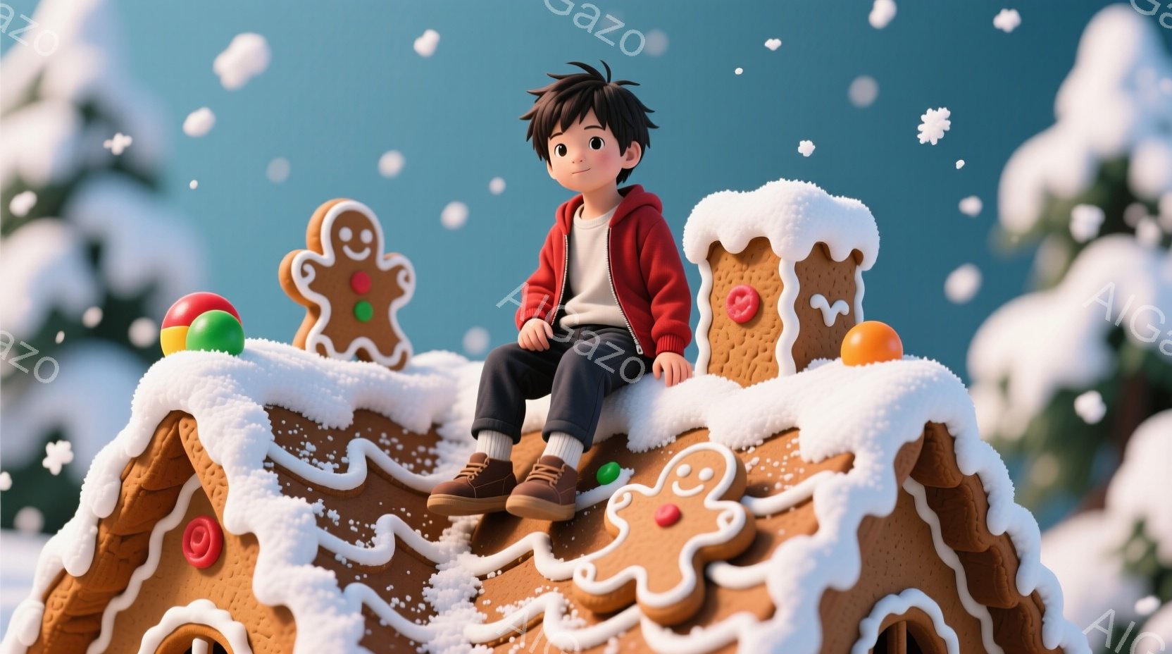 茶色の毛並みをした猫が、ジンジャーブレッドで作られた家の屋根の上に座っています。 猫は濃い青色のジャケットとスニーカーを着用し、少し不機嫌そうな表情をしています。 背景には雪が降り積もり、針葉樹の森が広がっており、全体的に冬の暖かくファンタジックな雰囲気が漂っています。