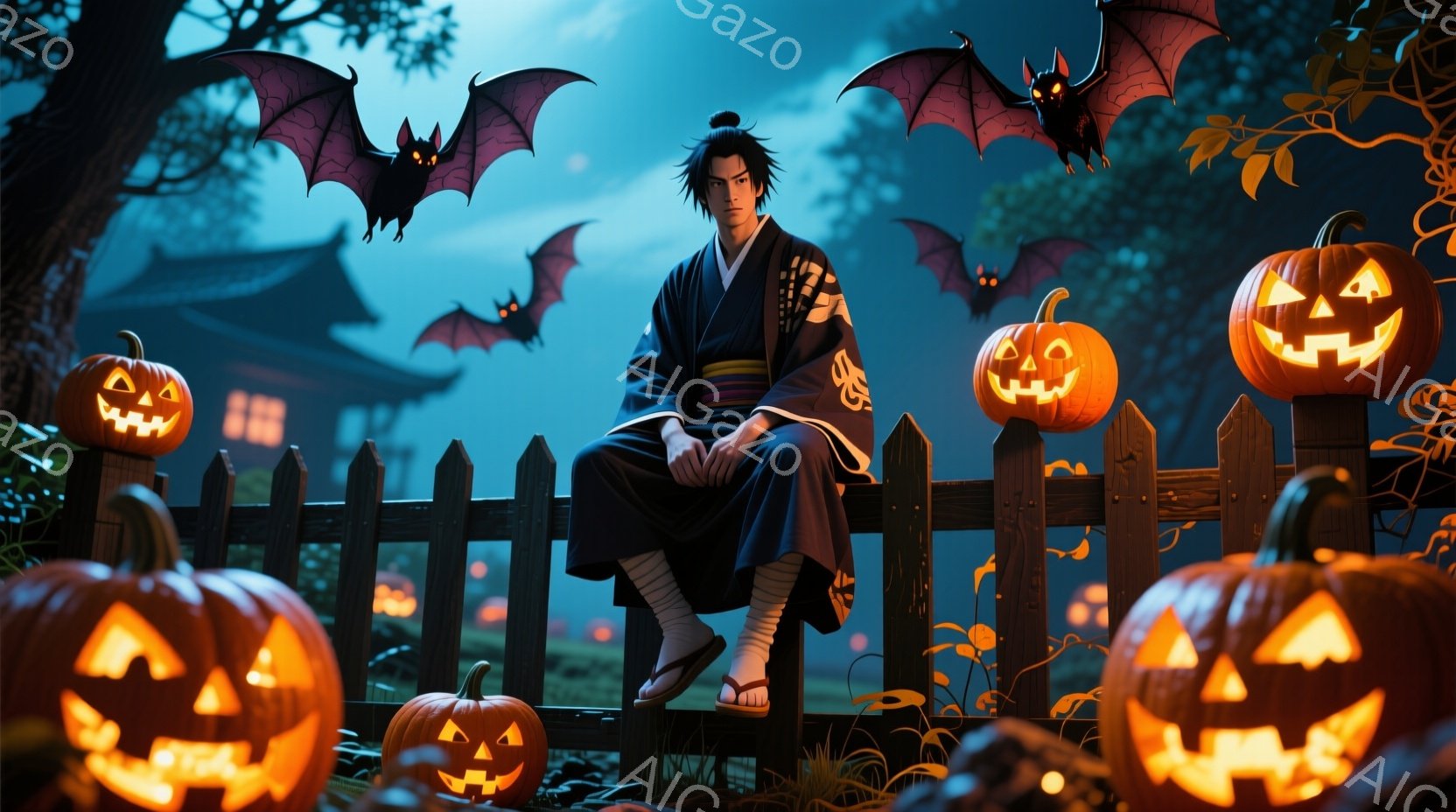 黒髪で、少し憂いを帯びた表情の少年が、フェンスの上に座っている。黒い和風の着物を着ており、背中には大きなコウモリの翼が生えている。背景には、ジャック・オー・ランタン、コウモリ、そしてぼんやりとした建物が見え、ハロウィーンの夜の不気味で幻想的な雰囲気を醸し出している。