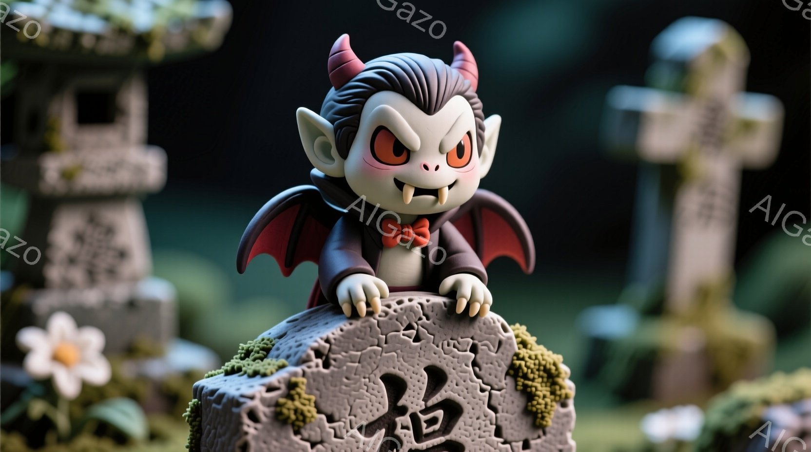 小さな吸血鬼が墓石に腰掛け、いたずらっぽい笑顔を浮かべている。黒い髪は後ろにとかされ、赤い目と鋭い牙が特徴的で、黒いマントと赤い蝶ネクタイを身につけている。背景には、緑豊かな木々や様々な形の墓石が見え、少し不気味でありながらもどこか愛らしい雰囲気を醸し出している。