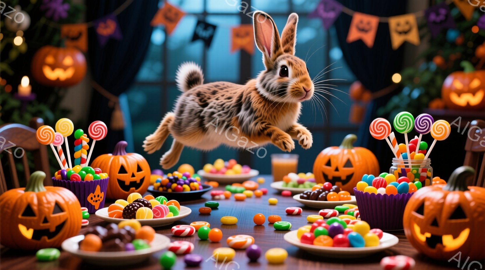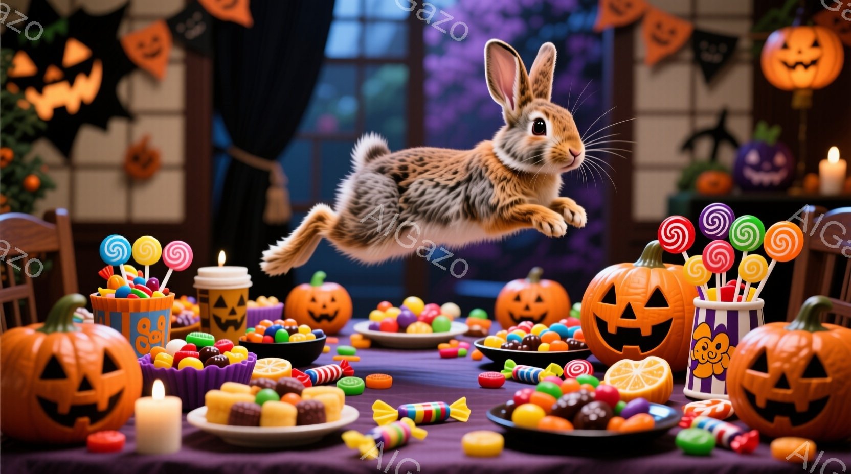 ハロウィンの飾り付けがされたテーブルの上に、カラフルなキャンディーやパンプキンが並べられています。テーブルの上空では、茶色のウサギが飛び跳ねており、その表情は楽しげで活発です。背景には様々な表情のジャック・オ・ランタンが配置され、お祭り気分を盛り上げています。