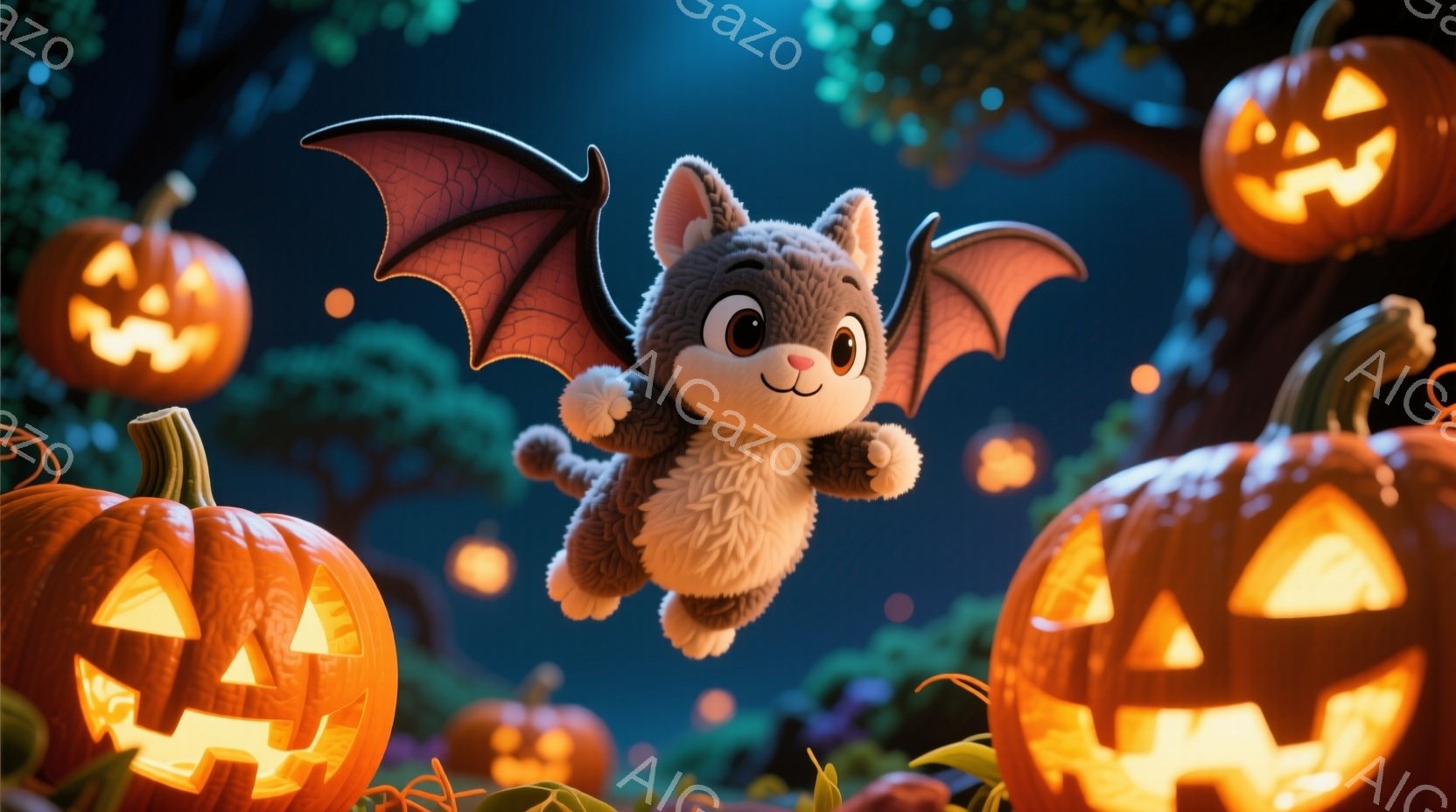 翼を持つふわふわの灰色の猫が、ハロウィーンの夜空を飛んでいる様子を描いています。背景には、ジャック・オー・ランタンが浮かび、暗い森が広がっており、全体的に陽気で楽しいハロウィーンの雰囲気が漂っています。猫は笑顔で、愛らしいポーズで空を舞い、祝祭の喜びを表現しています。