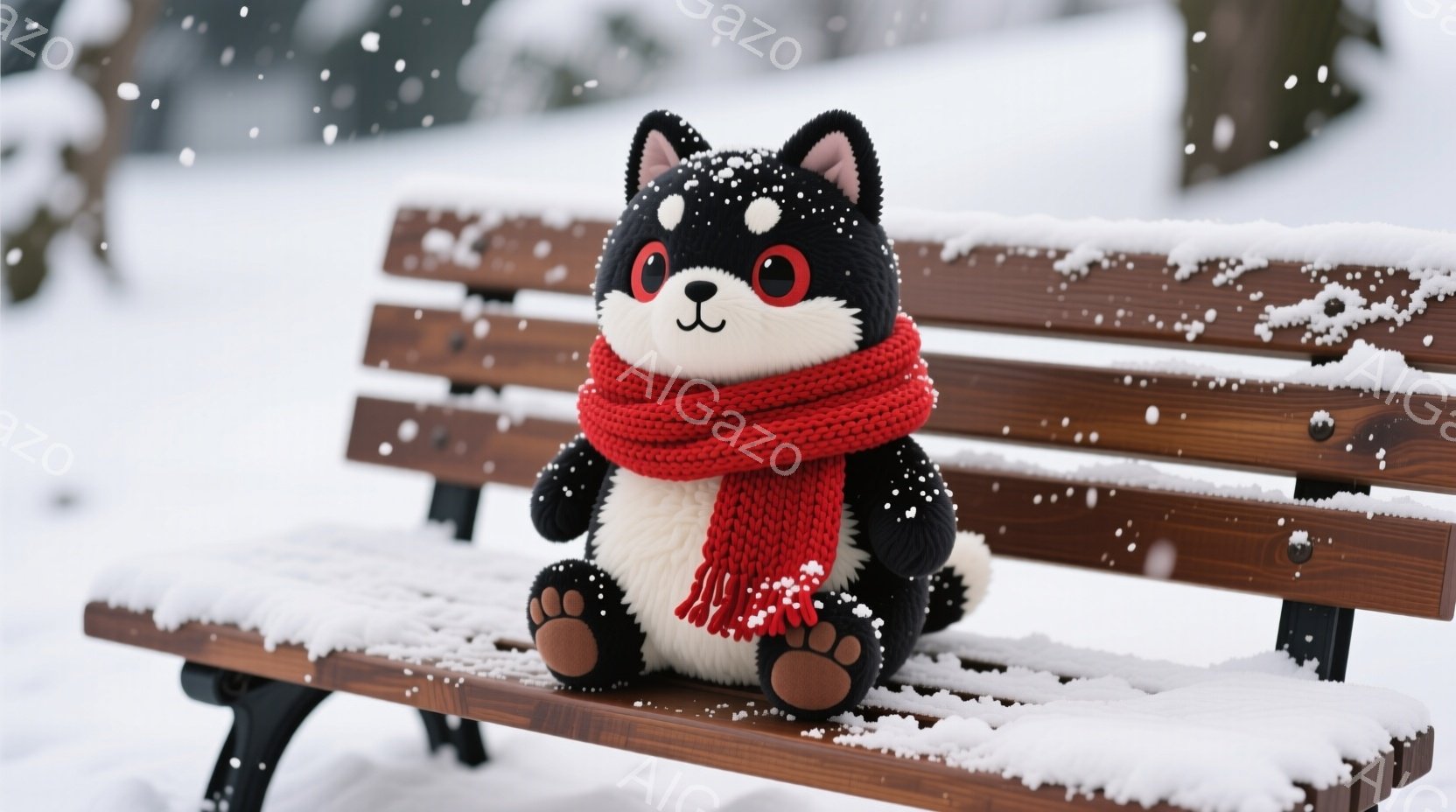灰色の毛並みをした、可愛らしい猫のぬいぐるみです。赤い編み物のマフラーを首に巻き、ベンチに座ってこちらを見ています。背景は雪景色で、雪が降っており、冬の静かで穏やかな雰囲気が漂っています。