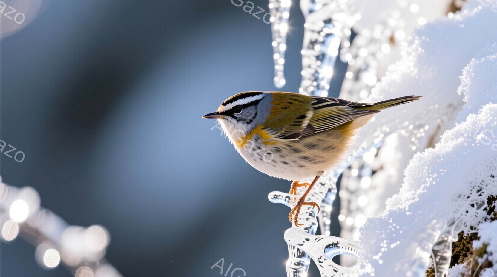 白と茶色の模様が美しい小さな鳥が、凍てついた枝にとまっています。周りには氷のつららが垂れ下がり、冬の寒々しい風景が広がっています。鳥は少しうつむき加減で、静かに寒さをしのいでいるように見えます。