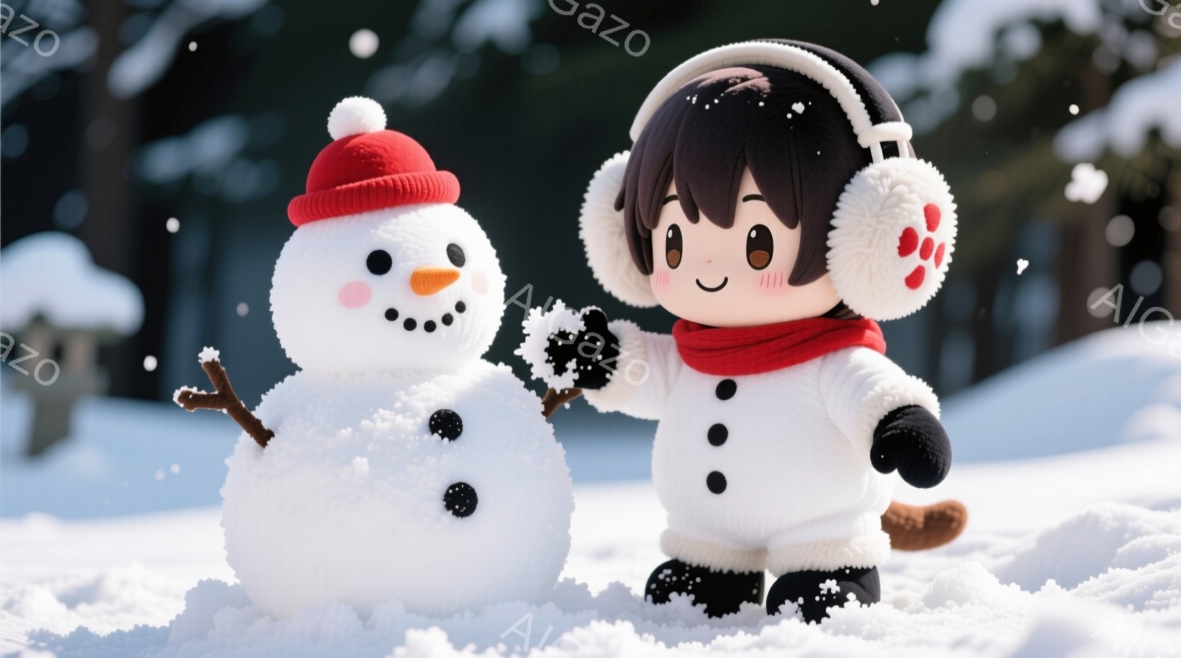 雪景色の中に、緑色のセーターを着た可愛らしい女の子がいます。彼女は茶色の短い髪をしており、耳当てをつけています。正面には雪だるまが立っており、女の子は雪だるまの肩に触れようとしています。