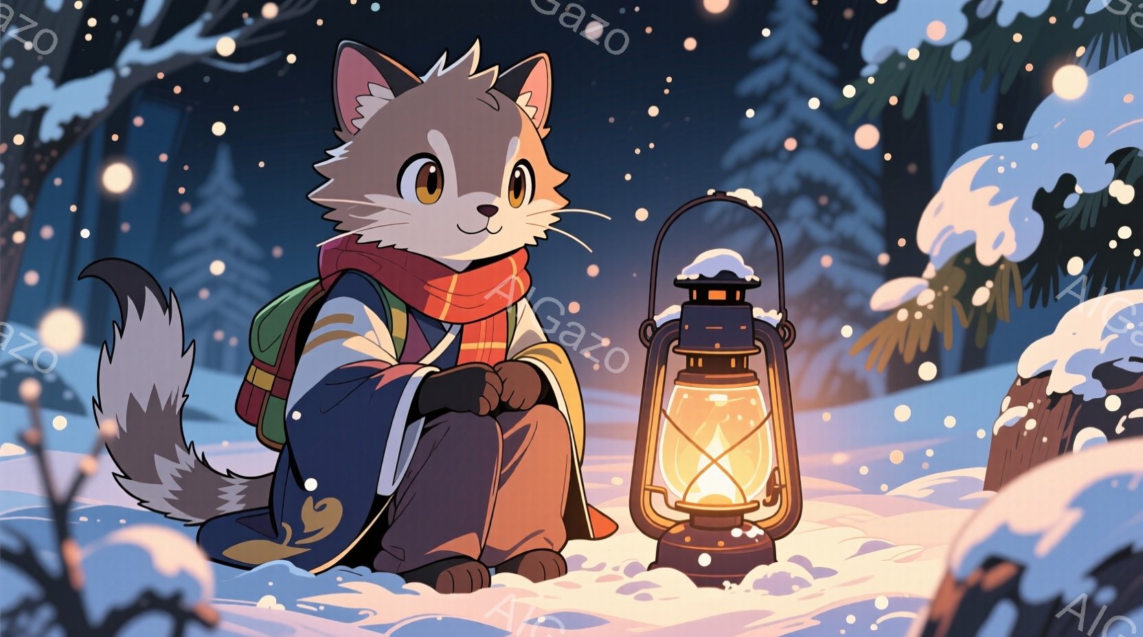 白髪の長い髪に、赤いリボンと花の髪飾りをつけた少女が描かれています。彼女は黒と緑の着物のような服を着て、雪の上に座り、明るいランタンを抱えています。背景には雪に覆われた木々があり、雪が舞う冬の夜の静かで幻想的な雰囲気を醸し出しています。